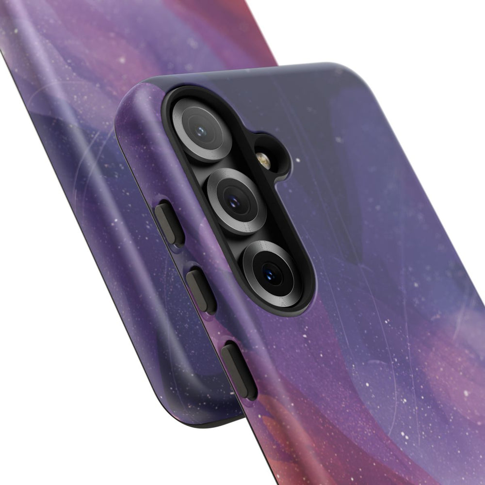 Dit hoesje toont de silhouet van een persoon op een heuvel die naar een levendige kosmische sterrenhemel kijkt, vol fonkelende sterren en draaiende nevels. Het landschap bestaat uit gestileerde planten en heuvels in paarse en roze tinten. De lucht is diepblauw en paars met heldere hemellichamen en gloeiende lichteffecten. Het hoesje heeft een dubbele laag met een matte afwerking, een stevige polycarbonaat buitenkant en een TPU-binnenzijde. Dit zorgt voor extra bescherming en is geschikt voor draadloos opladen.
