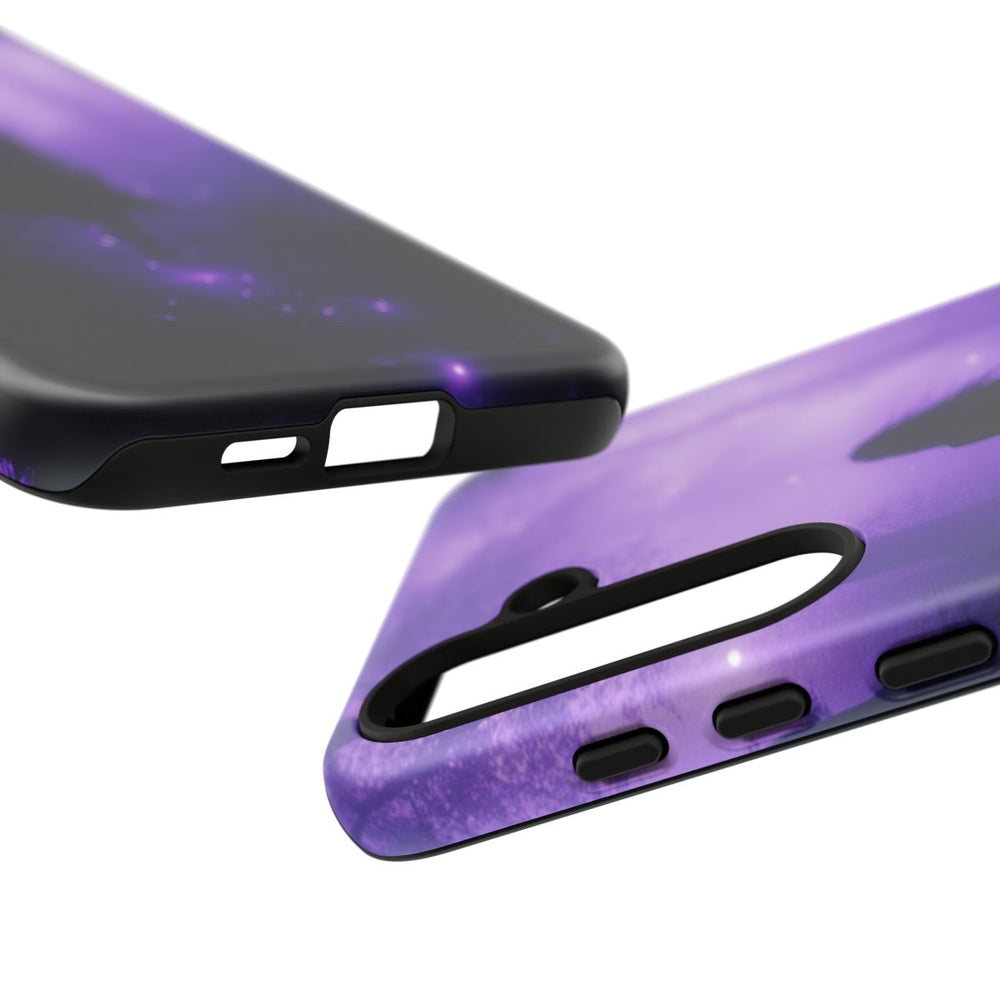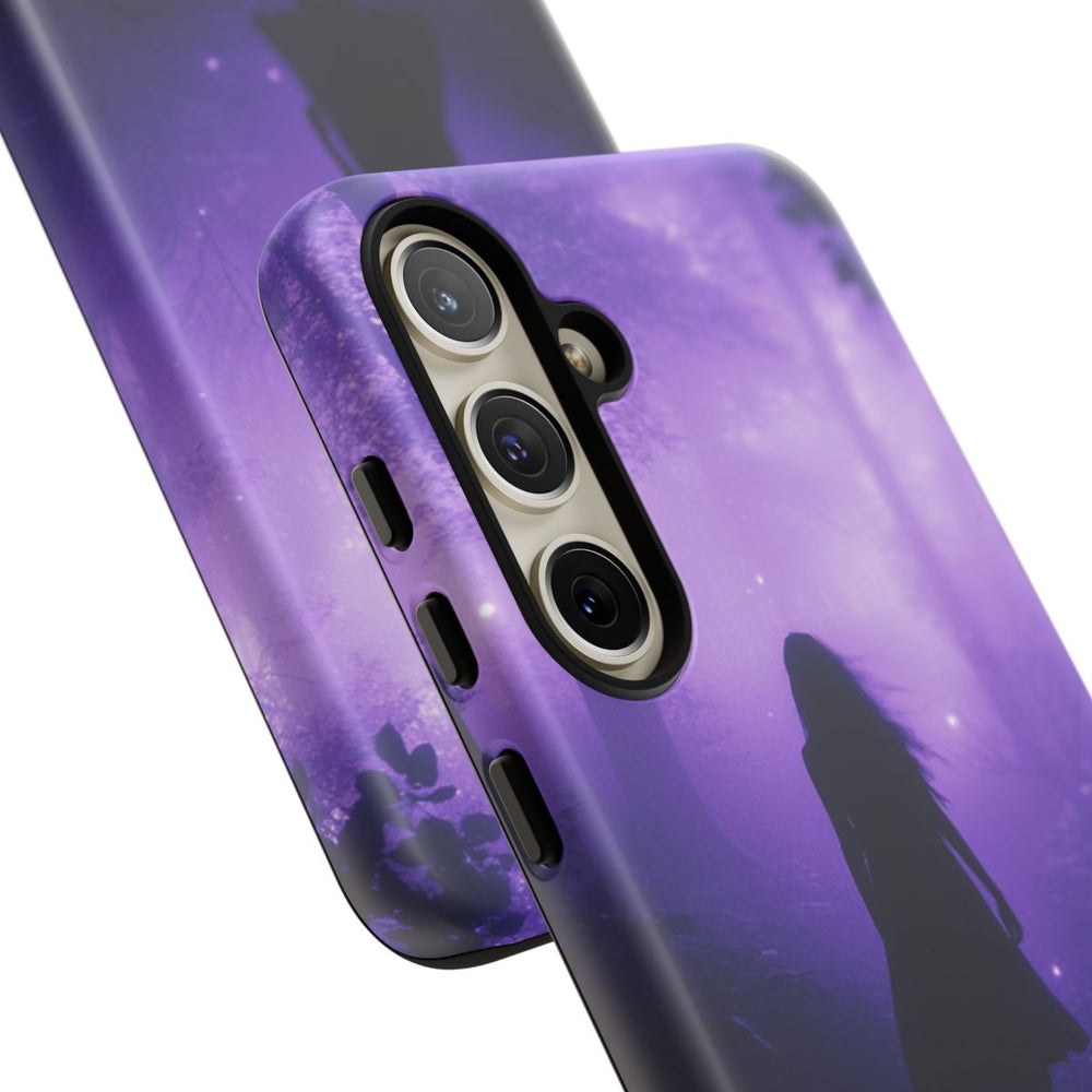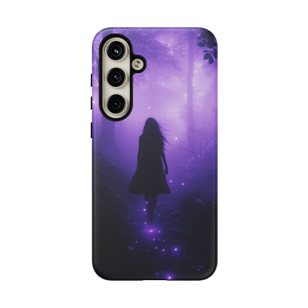Dit hoesje toont het silhouet van een vrouw die door een donker bos loopt, verlicht door een mysterieuze paarse gloed. Het bos is dicht begroeid met hoge bomen en op de grond liggen kleine lichtgevende bolletjes, met een oplichtende vlinder linksonder. De nevelige sfeer geeft het geheel een dromerige en geheimzinnige uitstraling. Het hoesje heeft een dubbele laag met een matte afwerking, een stevige polycarbonaat buitenkant en een TPU binnenzijde. Ontworpen voor optimale bescherming en geschikt voor draadloos opladen.