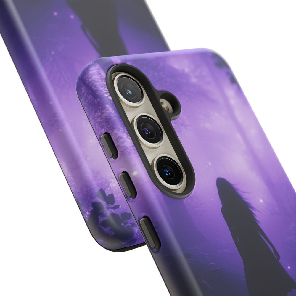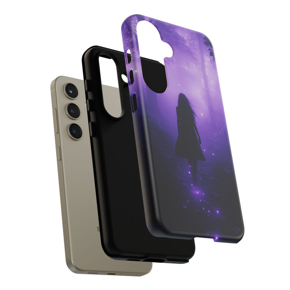 Dit hoesje toont een silhouet van een persoon die 's nachts over een bospad loopt. Het tafereel wordt verlicht door een krachtige paarse gloed, wat zorgt voor een mysterieuze en sfeervolle uitstraling. Langs het pad zweven kleine lichtgevende bolletjes en een oplichtende vlinder. Op de achtergrond zijn de bomen en het gebladerte van het bos zichtbaar, gehuld in paarse nevel. Het stevige hoesje heeft een dubbele laag van polycarbonaat en TPU en is ontworpen voor extra bescherming en ondersteuning van draadloos opladen.