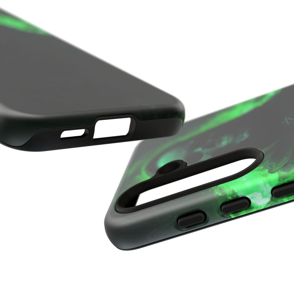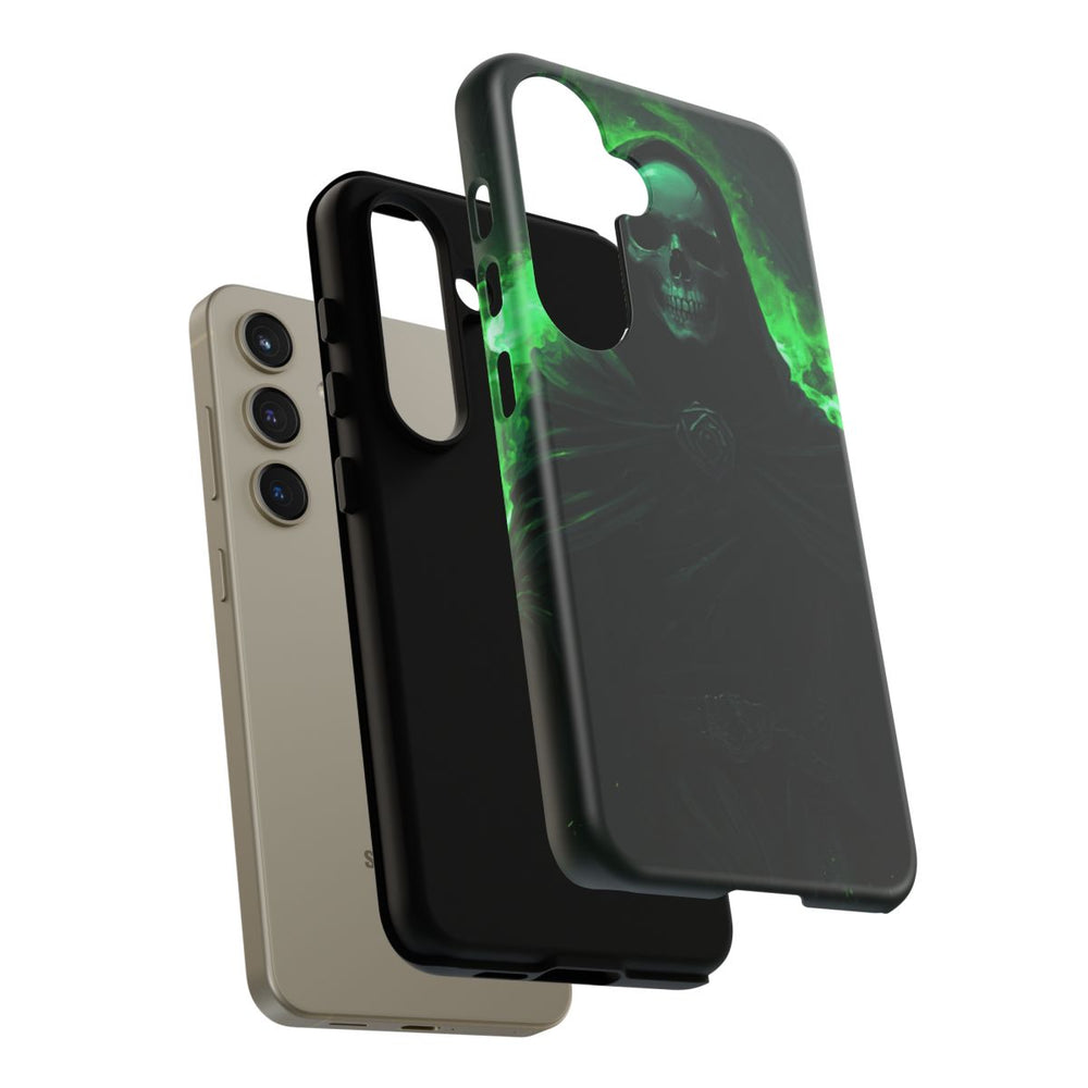 Dit hoesje toont een skelet in zwarte gewaden, staand in een duistere tempel met stenen bogen. De schedel is duidelijk zichtbaar en wordt omringd door wervelende groene magische vlammen of energie. De handen zijn geheven en groene vlammen komen uit de handpalmen. Het matte hoesje biedt stevige bescherming dankzij de dubbele laag van een polycarbonaat buitenkant en een TPU binnenzijde. Ontworpen voor duurzaamheid en geschikt voor draadloos opladen.