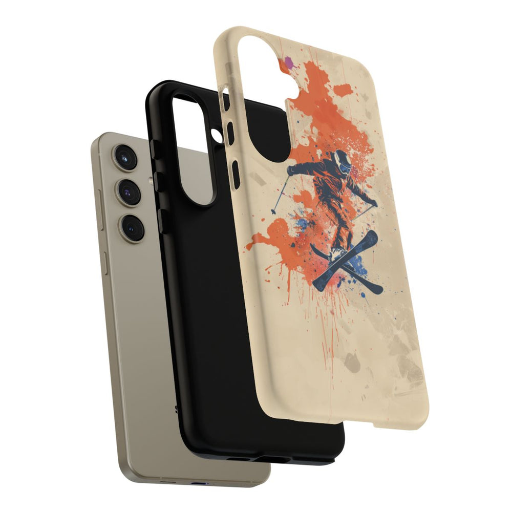 Dit ontwerp toont een skiër midden in een sprong, voorzien van een helm en skistokken. De skiër is afgebeeld in donkerblauwe en oranje tinten op een beige achtergrond. Rondom de skiër zijn dynamische verfspatten in fel oranje en blauw te zien, wat het geheel een krachtige en energieke uitstraling geeft. De afbeelding heeft een halftoon- en textuureffect voor een grafische en artistieke look. Dit matte, stevige hoesje biedt dubbele laag bescherming en ondersteunt draadloos opladen.
