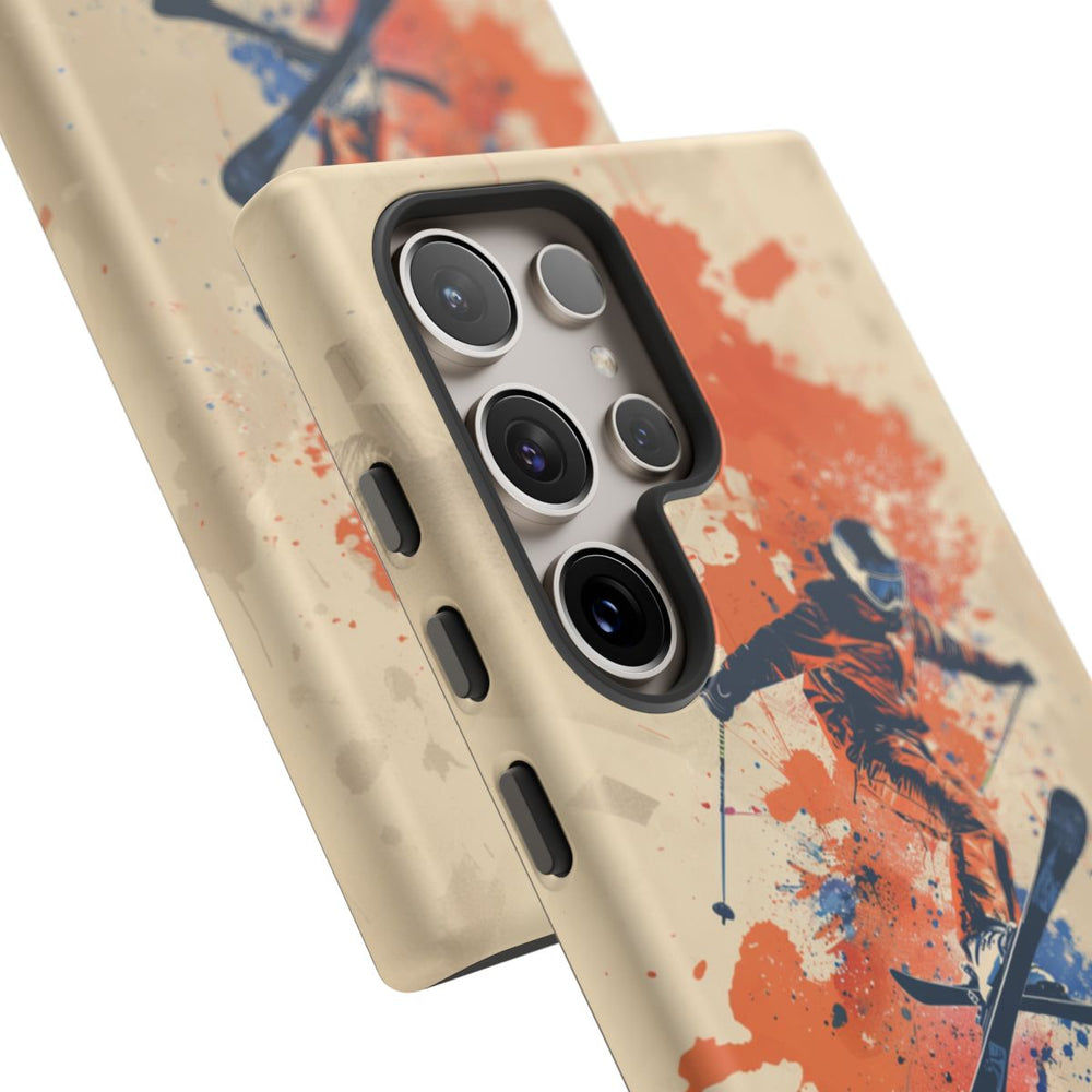 Dit ontwerp toont een skiër midden in een sprong, voorzien van een helm en skistokken. De skiër is afgebeeld in donkerblauwe en oranje tinten op een beige achtergrond. Rondom de skiër zijn dynamische verfspatten in fel oranje en blauw te zien, wat het geheel een krachtige en energieke uitstraling geeft. De afbeelding heeft een halftoon- en textuureffect voor een grafische en artistieke look. Dit matte, stevige hoesje biedt dubbele laag bescherming en ondersteunt draadloos opladen.