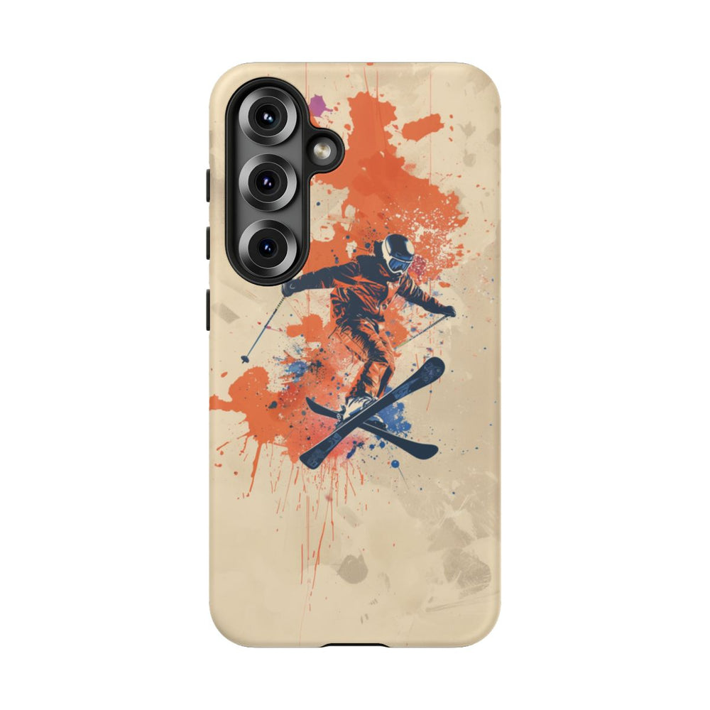 Dit ontwerp toont een skiër midden in een sprong, voorzien van een helm en skistokken. De skiër is afgebeeld in donkerblauwe en oranje tinten op een beige achtergrond. Rondom de skiër zijn dynamische verfspatten in fel oranje en blauw te zien, wat het geheel een krachtige en energieke uitstraling geeft. De afbeelding heeft een halftoon- en textuureffect voor een grafische en artistieke look. Dit matte, stevige hoesje biedt dubbele laag bescherming en ondersteunt draadloos opladen.
