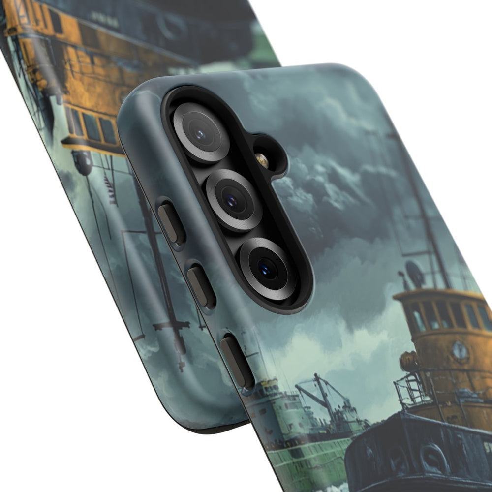 Dit hoesje toont een realistische afbeelding van een sleepboot met een geel-zwarte romp die door woelige, onstuimige golven vaart. De sleepboot trekt een groot groen vrachtschip voort in ruig water onder een indrukwekkende, bewolkte lucht. De scène brengt de kracht en intensiteit van een stormachtige oceaan tot leven. Het matte, stevige telefoonhoesje is gemaakt van polycarbonaat en TPU en biedt extra duurzaamheid en bescherming. Geschikt voor draadloos opladen.