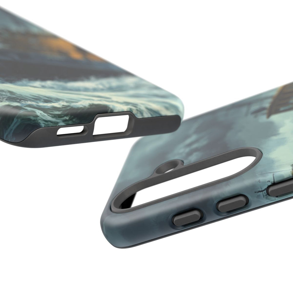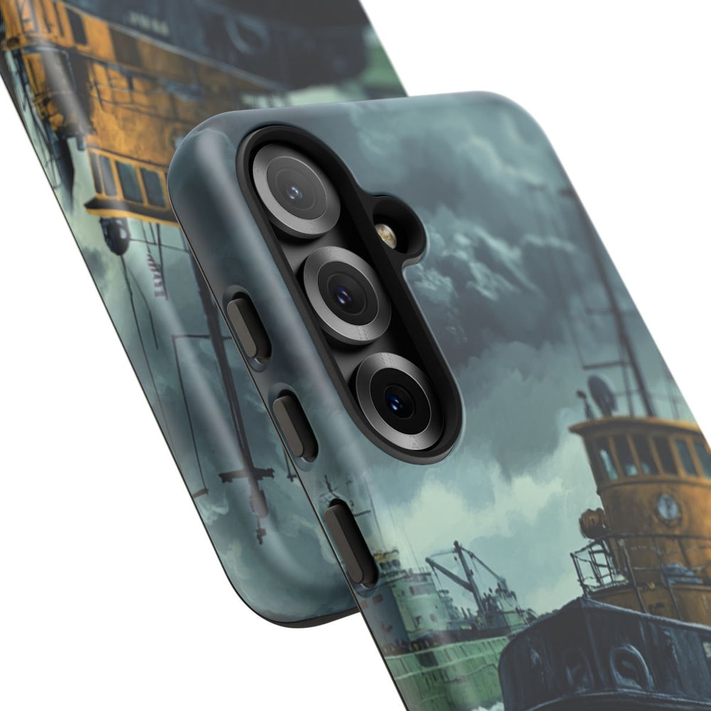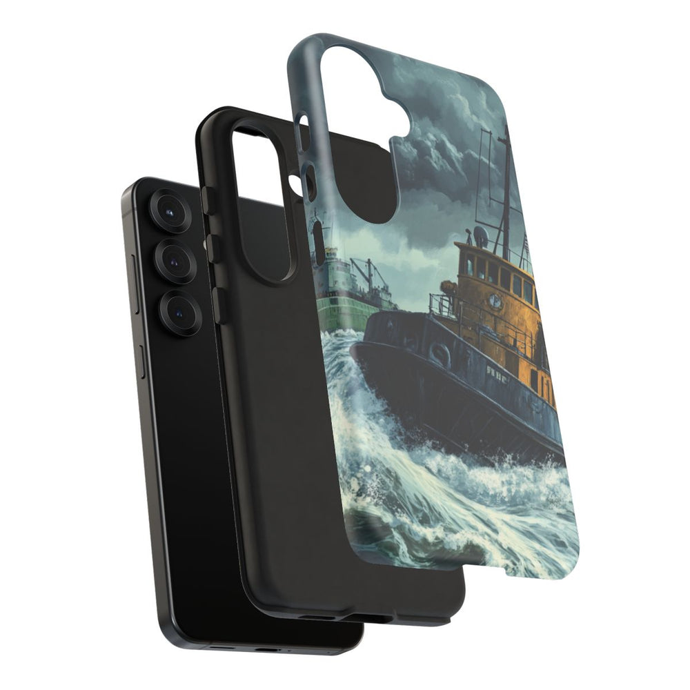 Dit hoesje toont een realistische illustratie in cartoonstijl van een sleepboot met een geel-zwarte romp die zich door ruige, onstuimige golven worstelt. Achter de sleepboot wordt een groot groen vrachtschip voortgetrokken. Donkere, dreigende wolken vullen de lucht en versterken de dramatische sfeer. Het matte hoesje bestaat uit twee lagen van polycarbonaat en TPU, biedt uitstekende bescherming en is bestand tegen intensief gebruik buitenshuis. Geschikt voor draadloos opladen.