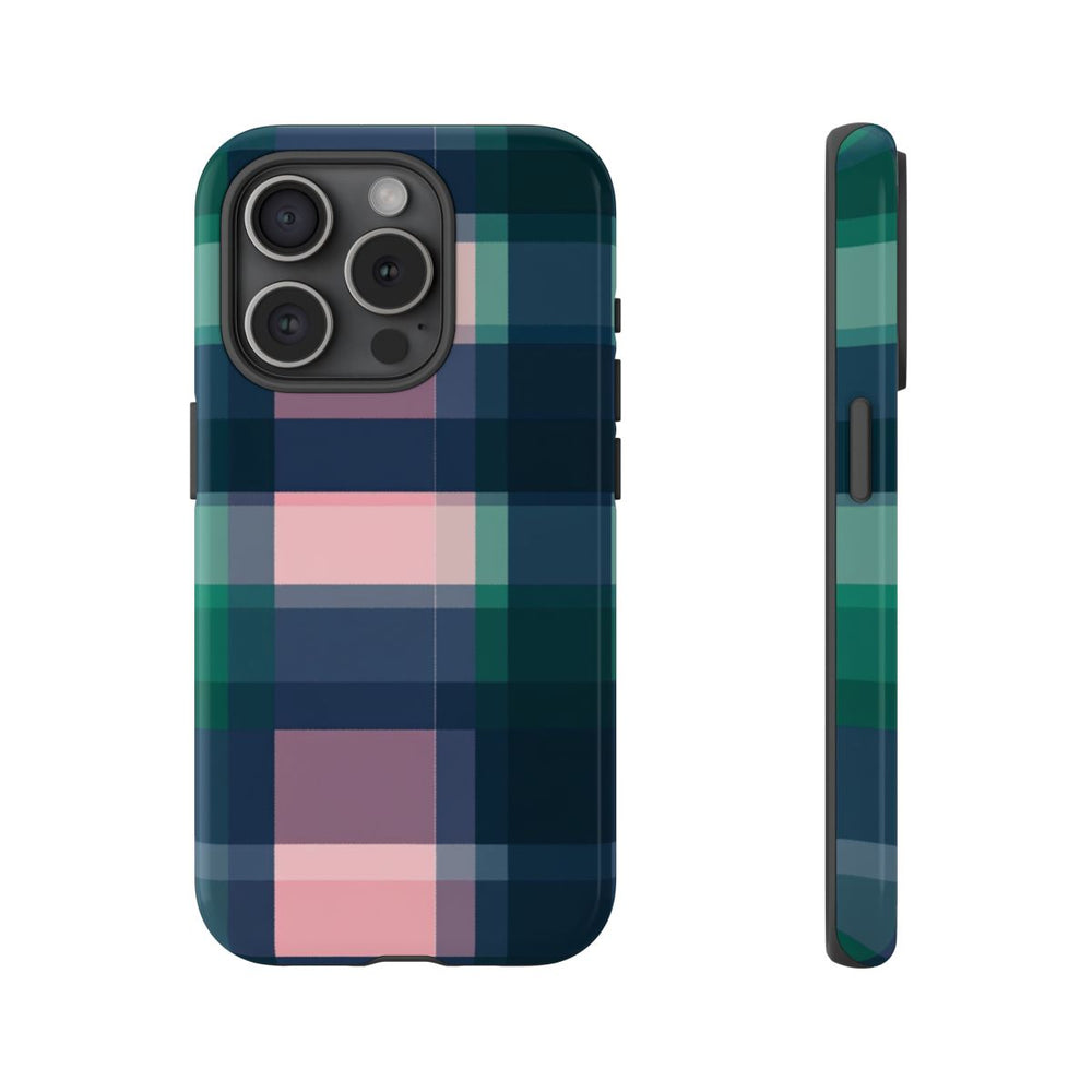 Dit hoesje heeft een naadloos geruit patroon met overlappende strepen in smaragdgroen, donkerblauw en roze tinten. Het ontwerp zorgt voor een klassieke ruitjeslook, waarbij de kleuren op sommige plekken transparanter zijn en zo een gelaagd effect ontstaat. Het hoesje is glanzend en extra stevig door de dubbele laag: een stevige polycarbonaat buitenkant en een schokabsorberende TPU binnenkant. Geschikt voor draadloos opladen en bestand tegen invloeden van buitenaf.