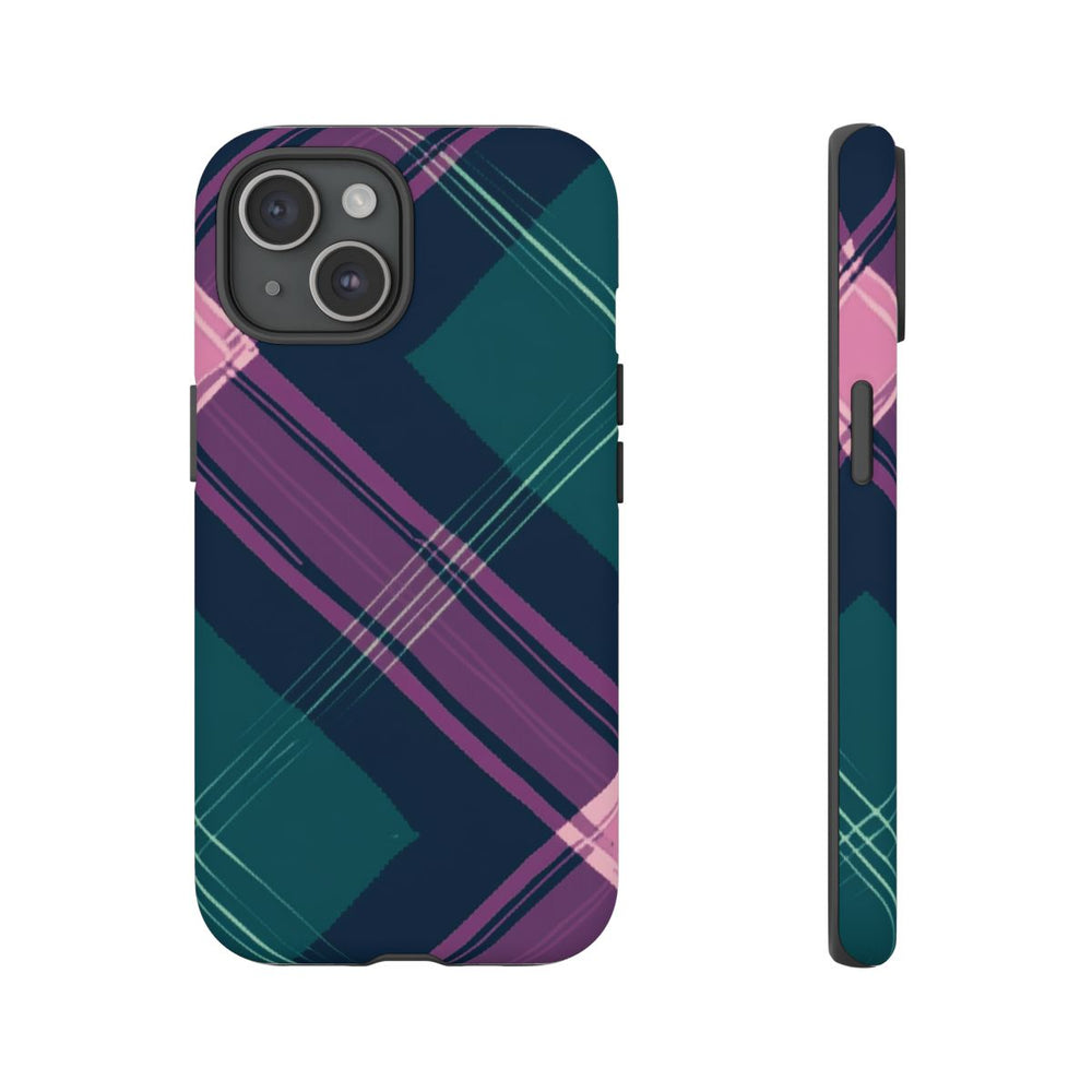 Dit telefoonhoesje is bedrukt met een naadloos geruit patroon op een smaragdgroene achtergrond. Over het ontwerp lopen kruislings lijnen in donkerblauw, roze en lichtgroen, waardoor een gelaagd en levendig effect ontstaat. Het patroon heeft een handgeschilderde uitstraling met zichtbare penseelstreken en een licht ruwe stijl. Het matte hoesje bestaat uit een stevige polycarbonaat buitenkant en een TPU binnenzijde, wat zorgt voor dubbele bescherming. Geschikt voor draadloos opladen.