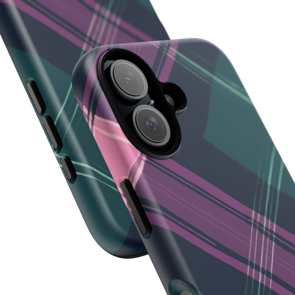 Dit telefoonhoesje is bedrukt met een naadloos geruit patroon op een smaragdgroene achtergrond. Over het ontwerp lopen kruislings lijnen in donkerblauw, roze en lichtgroen, waardoor een gelaagd en levendig effect ontstaat. Het patroon heeft een handgeschilderde uitstraling met zichtbare penseelstreken en een licht ruwe stijl. Het matte hoesje bestaat uit een stevige polycarbonaat buitenkant en een TPU binnenzijde, wat zorgt voor dubbele bescherming. Geschikt voor draadloos opladen.