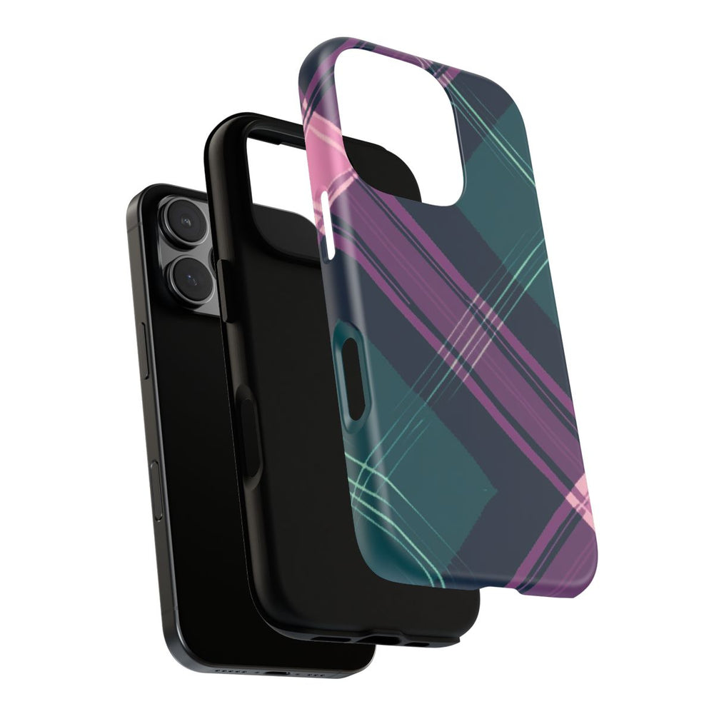 Dit telefoonhoesje is bedrukt met een naadloos geruit patroon op een smaragdgroene achtergrond. Over het ontwerp lopen kruislings lijnen in donkerblauw, roze en lichtgroen, waardoor een gelaagd en levendig effect ontstaat. Het patroon heeft een handgeschilderde uitstraling met zichtbare penseelstreken en een licht ruwe stijl. Het matte hoesje bestaat uit een stevige polycarbonaat buitenkant en een TPU binnenzijde, wat zorgt voor dubbele bescherming. Geschikt voor draadloos opladen.