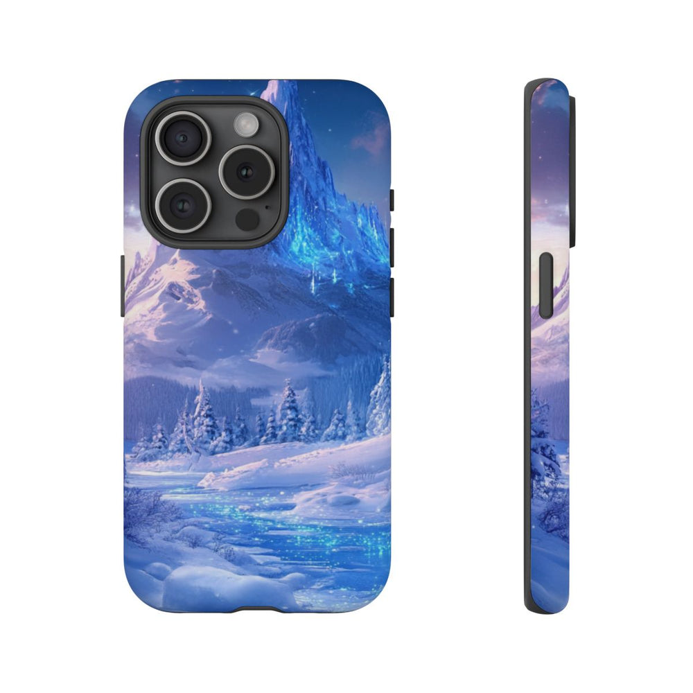 Dit hoesje heeft een prachtig ontwerp van een besneeuwde berg met scherpe toppen onder een sterrenhemel. Op de voorgrond stroomt een bevroren rivier die blauw oplicht, omringd door met sneeuw bedekte dennenbomen en een wit winterlandschap. De sfeer is magisch en winters, met zachte roze en blauwe tinten in de lucht. Het hoesje bestaat uit twee stevige lagen van polycarbonaat en TPU, en ondersteunt draadloos opladen.
