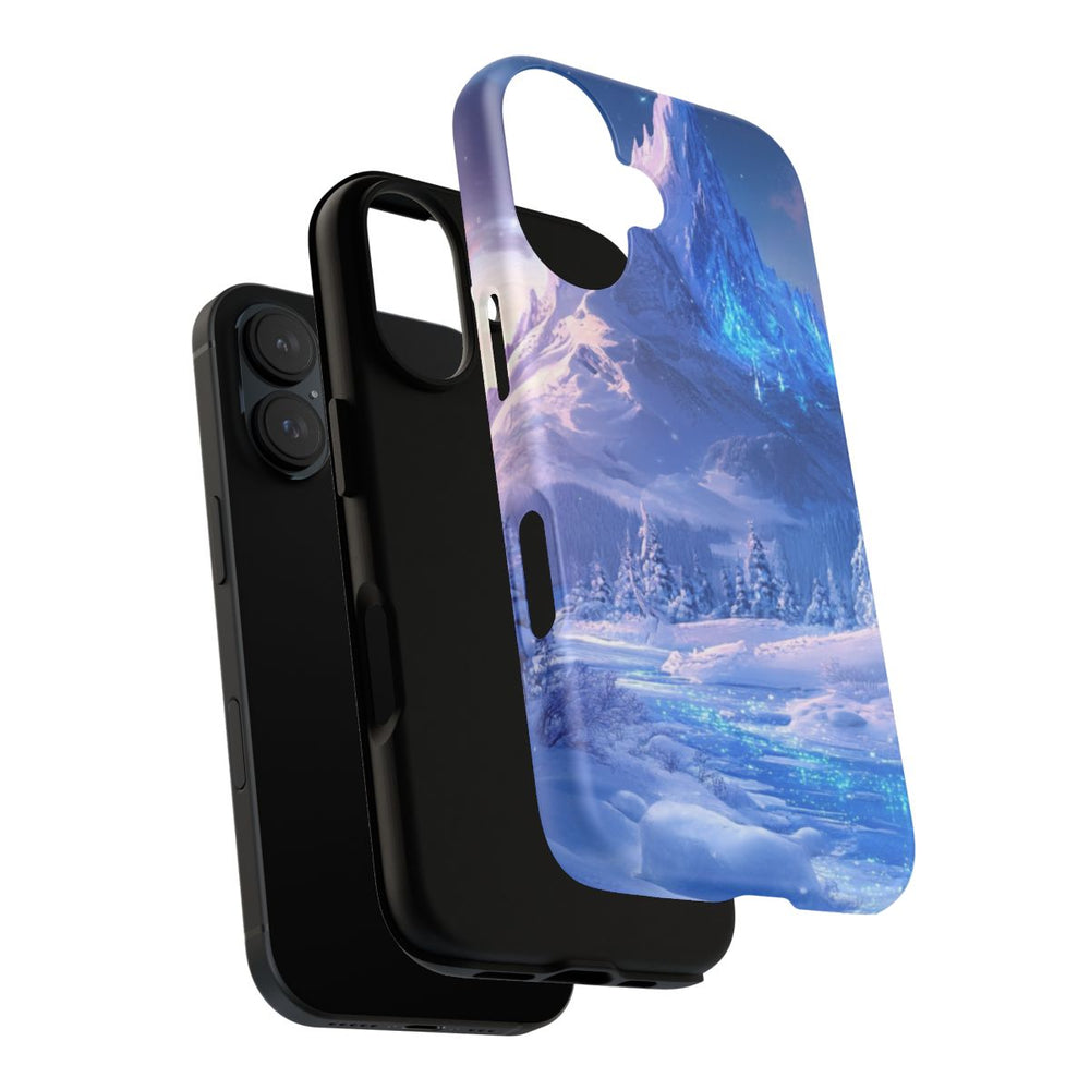 Dit hoesje heeft een prachtig ontwerp van een met sneeuw bedekte berg met scherpe toppen onder een schemerende sterrenhemel en zachte wolken. Op de voorgrond stroomt een bevroren rivier die blauw oplicht, omringd door besneeuwde dennenbomen. De afbeelding straalt de rust uit van een winterse droomwereld met koele blauwe en paarse tinten. Het hoesje bestaat uit een stevige polycarbonaat buitenkant en een TPU-binnenlaag, ondersteunt draadloos opladen en biedt extra bescherming voor je telefoon.