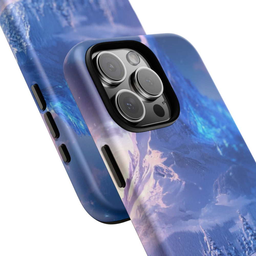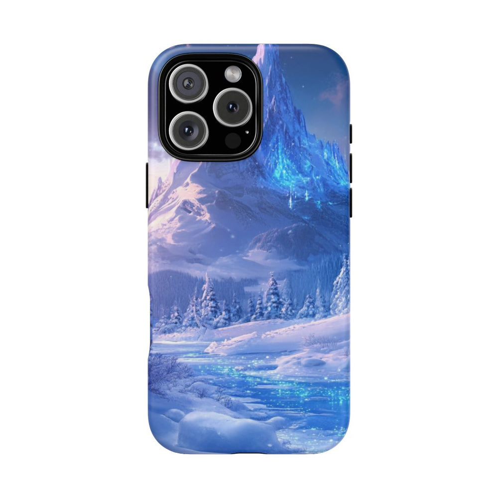 Dit hoesje heeft een prachtig ontwerp van een besneeuwde berg met scherpe toppen onder een schemerende sterrenhemel en zachte wolken. Op de voorgrond stroomt een bevroren rivier die blauw oplicht, omringd door met sneeuw bedekte dennen en een witte wintergrond. De afbeelding roept de sfeer op van een rustige winterwereld met koele blauwe en paarse tinten. Het hoesje bestaat uit twee lagen: een stevige polycarbonaat buitenkant en een TPU-binnenzijde, en is geschikt voor draadloos opladen.