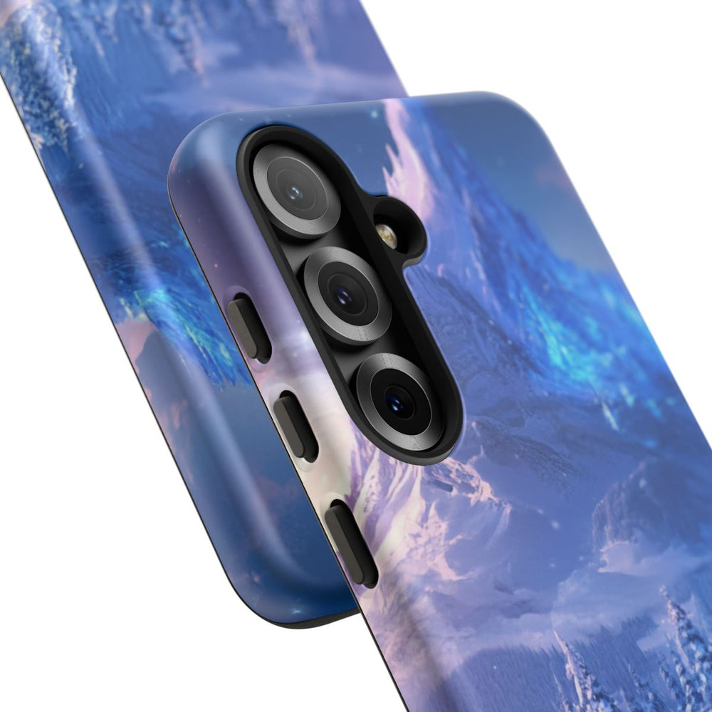 Dit hoesje is voorzien van een schitterend ontwerp met een majestueuze besneeuwde berg met scherpe pieken onder een schemerende hemel vol sterren en zachte wolken. Op de voorgrond stroomt een bevroren rivier die blauw oplicht, omringd door met sneeuw bedekte bomen en oevers. De afbeelding roept de sfeer op van een rustige winterwereld in koele blauwe en paarse tinten. Het hoesje bestaat uit een stevige polycarbonaat buitenkant en een TPU-binnenzijde voor dubbele bescherming en is geschikt voor draadloos opladen.