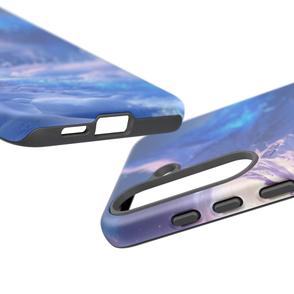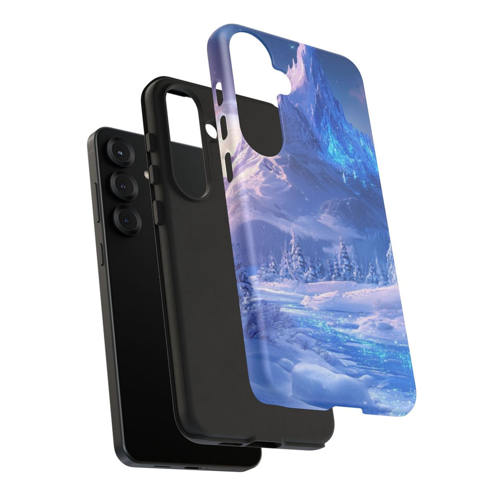 Dit hoesje toont een indrukwekkend berglandschap met besneeuwde toppen onder een schemerende hemel vol sterren en zachte wolken. Op de voorgrond zie je met sneeuw bedekte bomen en een sprankelende rivier die door het winterse landschap stroomt. Het ontwerp is uitgevoerd in koele blauwe en paarse tinten met subtiele roze accenten. Het hoesje bestaat uit een stevige polycarbonaat buitenkant en een TPU-binnenzijde voor optimale bescherming en is geschikt voor draadloos opladen.