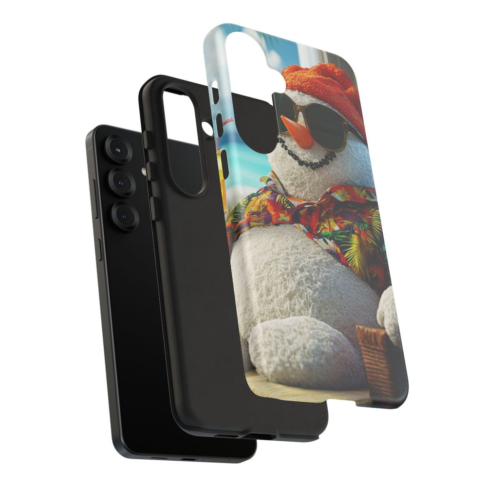 Dit telefoonhoesje toont een afbeelding van een sneeuwpop van boucléstof die ontspannen zit in een rotan stoel met een beige kussen. De sneeuwpop draagt een felrode hoed, donkere zonnebril en een kleurrijk Hawaïshirt met tropische motieven. In zijn hand houdt hij een glas ijskoude limonade met een rood-wit gestreept rietje. Op de achtergrond is een tropische omgeving te zien met palmbladeren en een blauwe lucht door het raam. Het hoesje heeft een dubbele laag met een buitenkant van polycarbonaat en een binnenzijde van TPU, en ondersteunt draadloos opladen.
