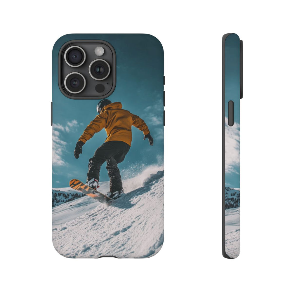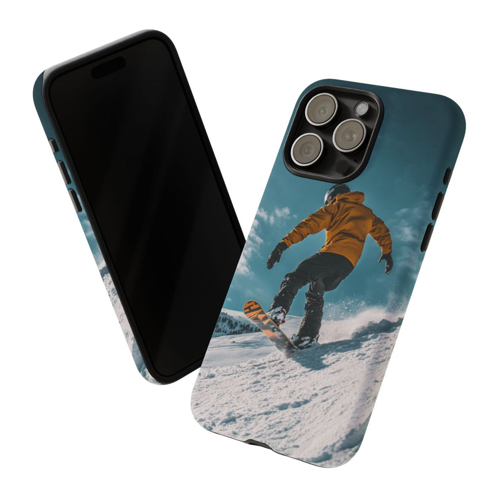 Dit telefoonhoesje toont een snowboarder die van een besneeuwde helling afdaalt. De snowboarder draagt een gele jas, zwarte broek, zwarte handschoenen en een zwarte helm. Het snowboard heeft een oranje met zwart ontwerp. Op de achtergrond zie je een heldere blauwe lucht met enkele wolken en in de verte met sneeuw bedekte bomen. Het matte, stevige hoesje heeft een dubbele laag voor extra bescherming, is gemaakt van polycarbonaat en TPU en ondersteunt draadloos opladen.