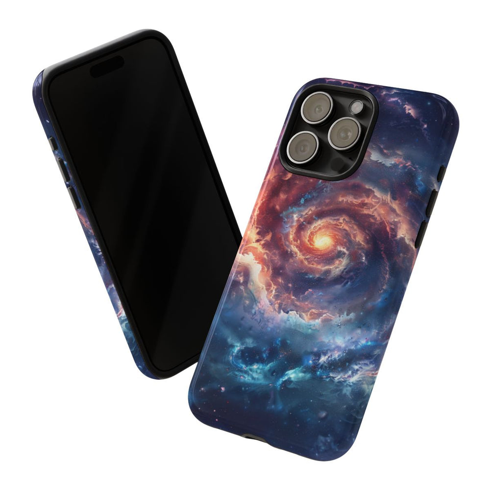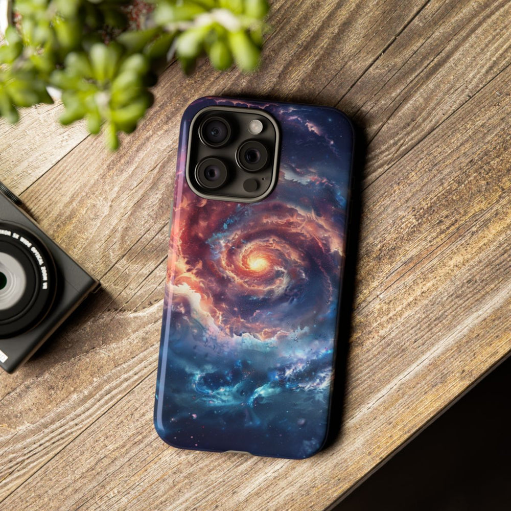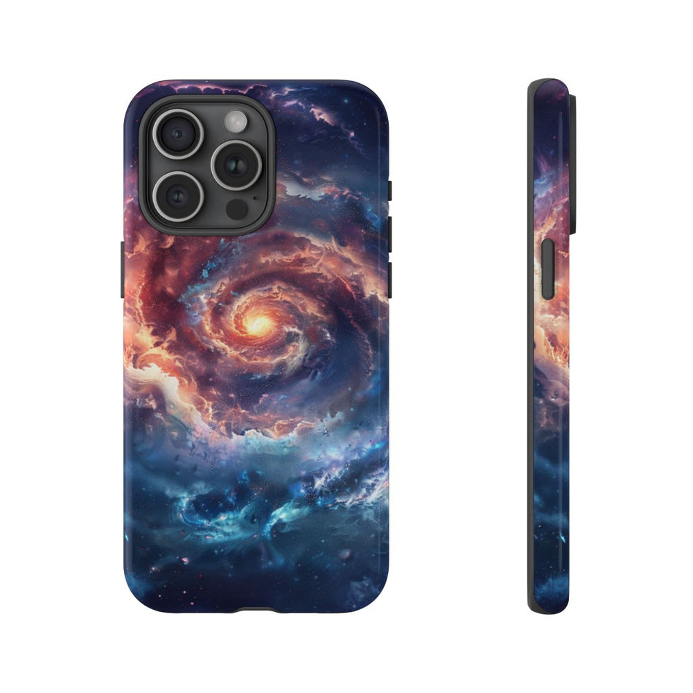 Dit hoesje toont een levendige spiraalnevel met draaiende wolken van kosmisch stof en heldere sterren. In het midden straalt een warme gloed in gele en oranje tinten, die geleidelijk overloopt in koelere blauwen en paarstinten aan de randen. Het ontwerp vangt de dynamische en kleurrijke uitstraling van een sterrenstelsel in de diepe ruimte, tegen een donkere sterrenhemel. Het hoesje heeft een glanzende afwerking, een stevige polycarbonaat buitenkant en een TPU-binnenlaag voor dubbele bescherming. Ondersteunt draadloos opladen.