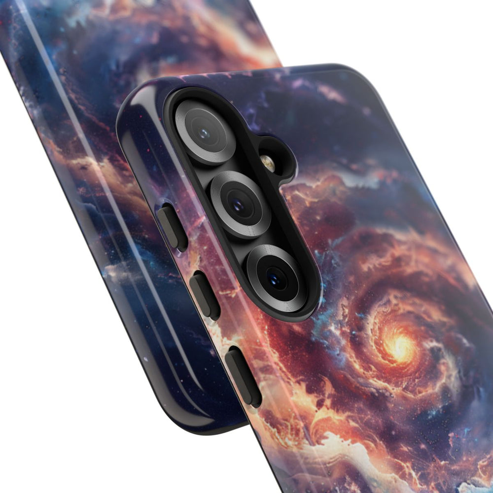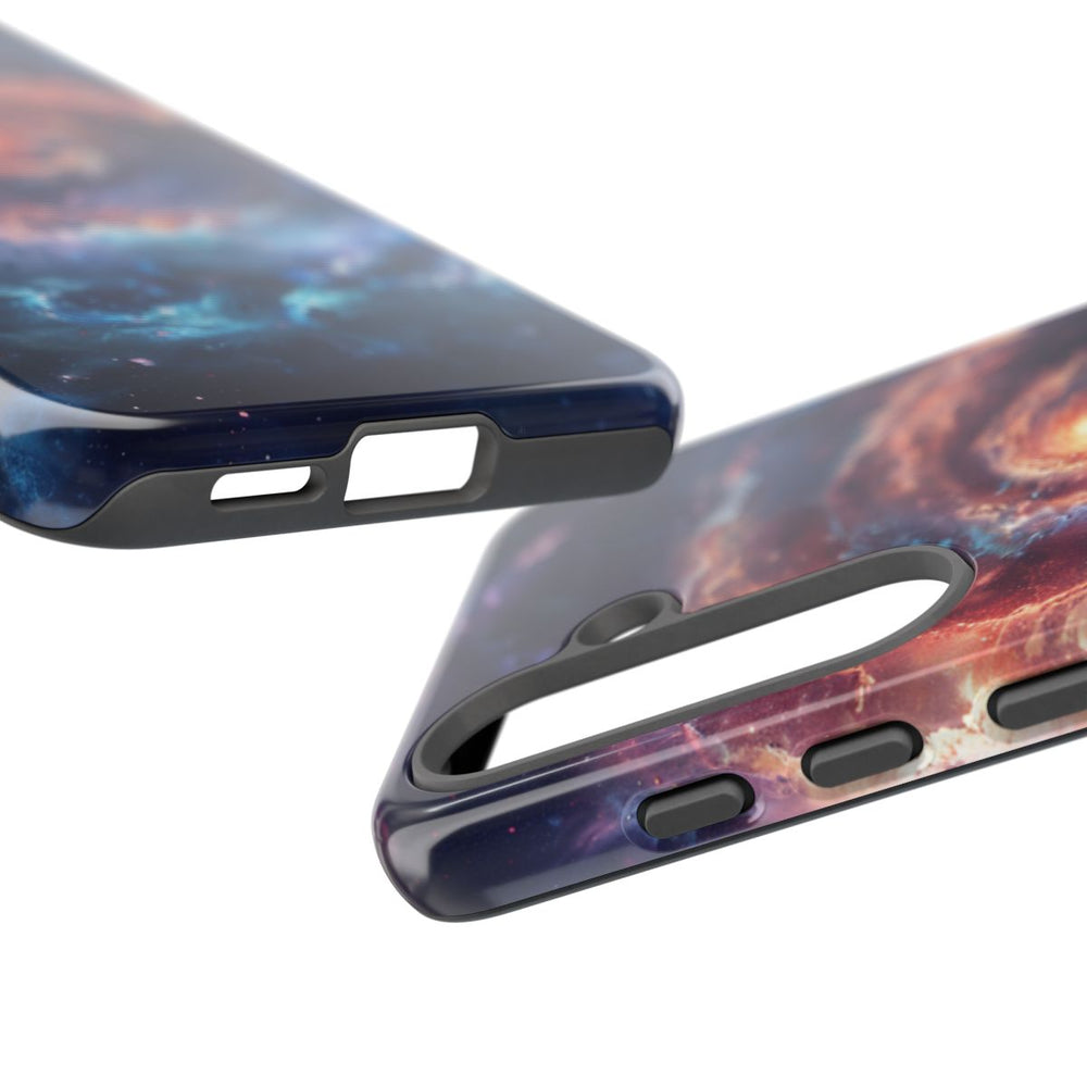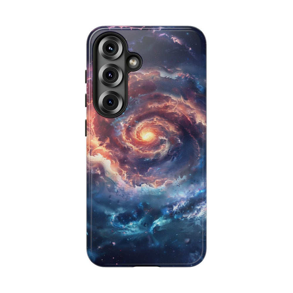 Dit hoesje toont een levendige spiraalnevel met draaiende wolken van kosmisch stof en heldere sterren. In het midden straalt een warme gloed in gele en oranje tinten, die geleidelijk overloopt in koelere blauwen en paarstinten aan de randen. Het ontwerp vangt de dynamische en kleurrijke uitstraling van een sterrenstelsel in de diepe ruimte, tegen een donkere sterrenhemel. Het hoesje heeft een glanzende afwerking, een stevige polycarbonaat buitenkant en een TPU-binnenlaag voor dubbele bescherming. Ondersteunt draadloos opladen.