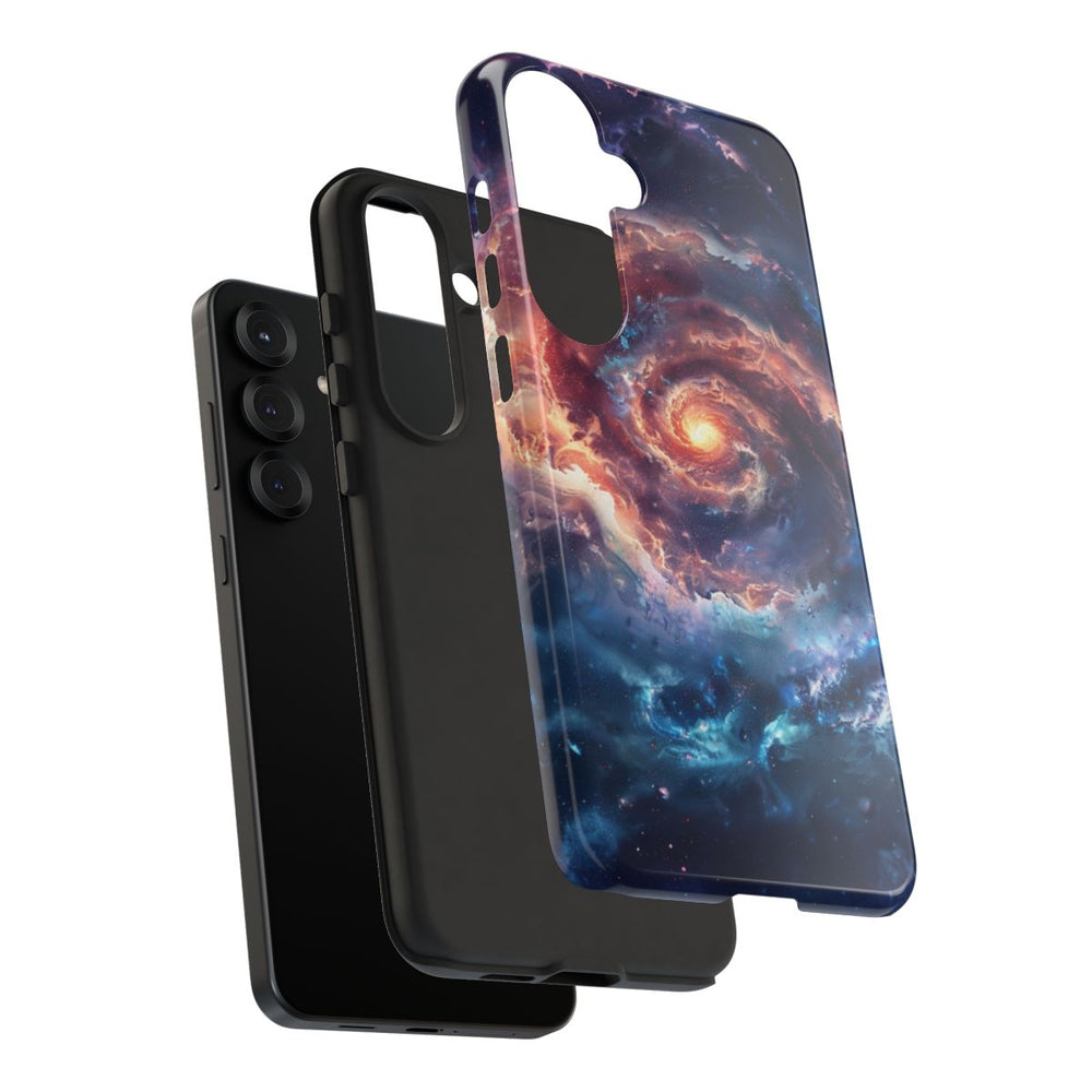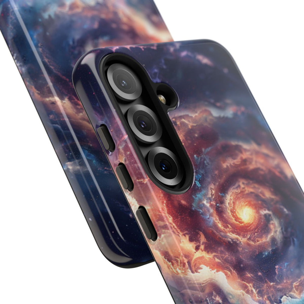 Dit hoesje toont een levendige spiraalnevel met draaiende wolken van kosmisch stof en heldere sterren. In het midden straalt een warme gloed in gele en oranje tinten, die geleidelijk overloopt in koelere blauwen en paarstinten aan de randen. Het ontwerp vangt de dynamische en kleurrijke uitstraling van een sterrenstelsel in de diepe ruimte, tegen een donkere sterrenhemel. Het hoesje heeft een glanzende afwerking, een stevige polycarbonaat buitenkant en een TPU-binnenlaag voor dubbele bescherming. Ondersteunt draadloos opladen.