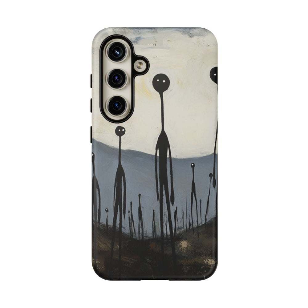 Dit hoesje is voorzien van een duister en mysterieus landschap met lange, dunne stokfiguren die verspreid staan over een glooiend terrein. Op de achtergrond zie je een bewolkte lucht in gedempte grijs- en beige tinten, terwijl de grond is uitgevoerd in donkere bruin- en zwarttinten. Kale bomen met dunne takken omlijsten het geheel en versterken de onheilspellende sfeer. Het hoesje bestaat uit twee lagen met een matte afwerking en is vervaardigd van polycarbonaat en TPU. Ondersteunt draadloos opladen.
