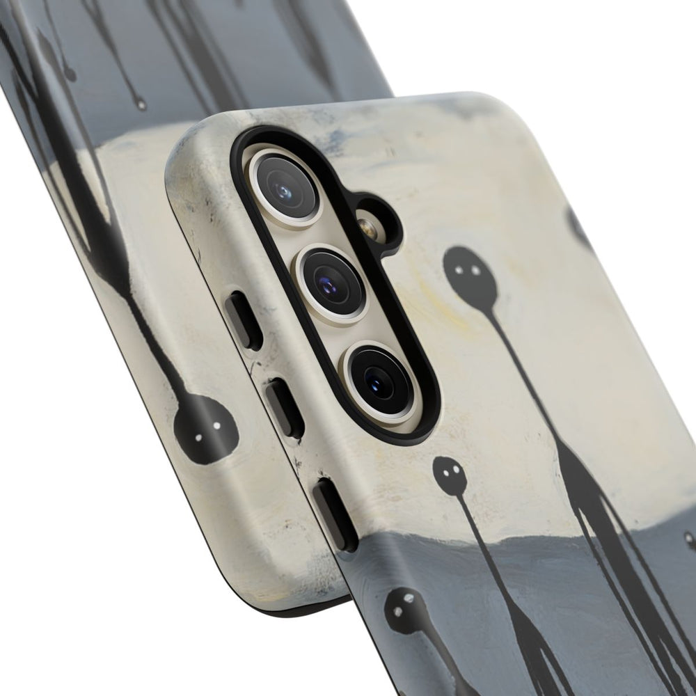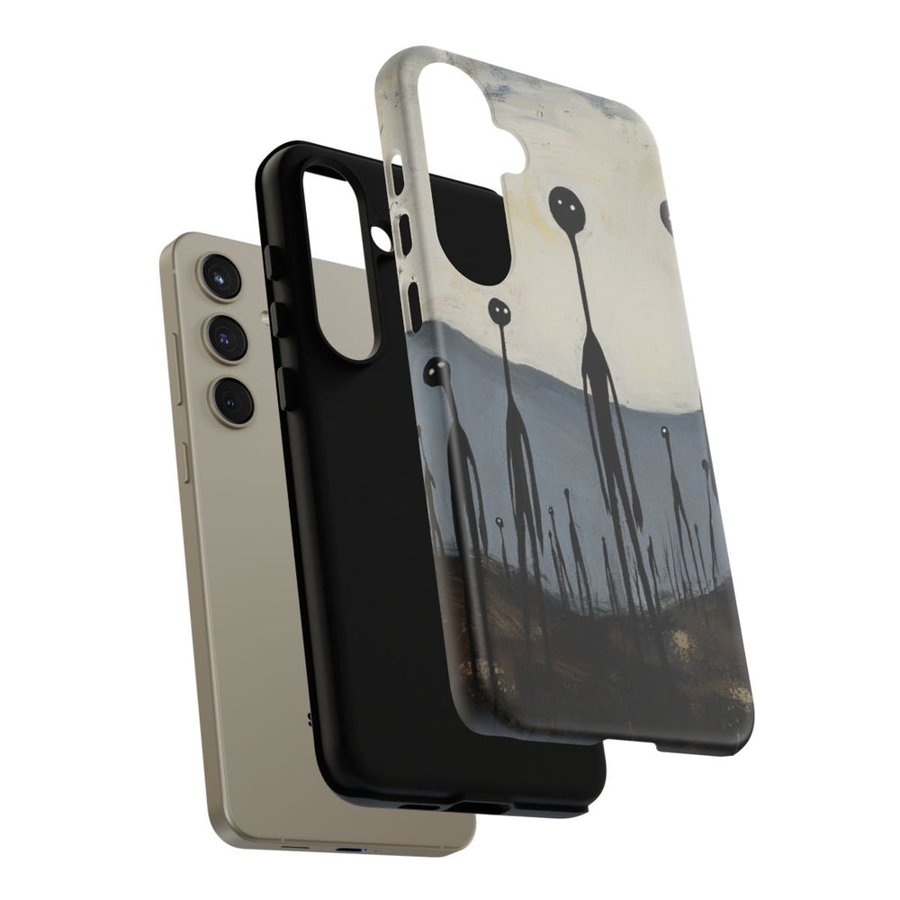 Dit telefoonhoesje toont een duister en mysterieus landschap met lange, dunne stokfiguren met ronde hoofden en lichtgevende, witte ogen. Op de achtergrond zie je een bewolkte lucht in gedempte tinten grijs en beige, met kale bomen verspreid over het tafereel. De ondergrond is donker met bruine en zwarte accenten, wat zorgt voor een beklemmende sfeer. Het hoesje bestaat uit twee lagen: een stevige polycarbonaat buitenkant en een TPU binnenzijde. Geschikt voor draadloos opladen.