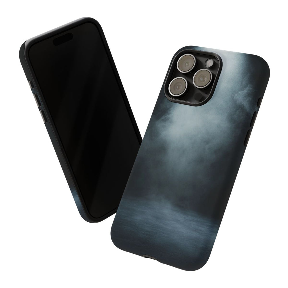 Dit hoesje heeft een stijlvol ontwerp met een donkere achtergrond die sfeervol wordt verlicht door een zacht spotlicht van bovenaf. In het licht zweven lichte slierten mist of rook, wat zorgt voor een mysterieuze en bijzondere uitstraling. Onderaan is een subtiel verlichte, getextureerde ondergrond zichtbaar. Het minimalistische ontwerp met veel lege ruimte maakt het ook geschikt voor het toevoegen van tekst. Het hoesje bestaat uit twee lagen: een stevige polycarbonaat buitenkant en een TPU-binnenzijde. Ondersteunt draadloos opladen.