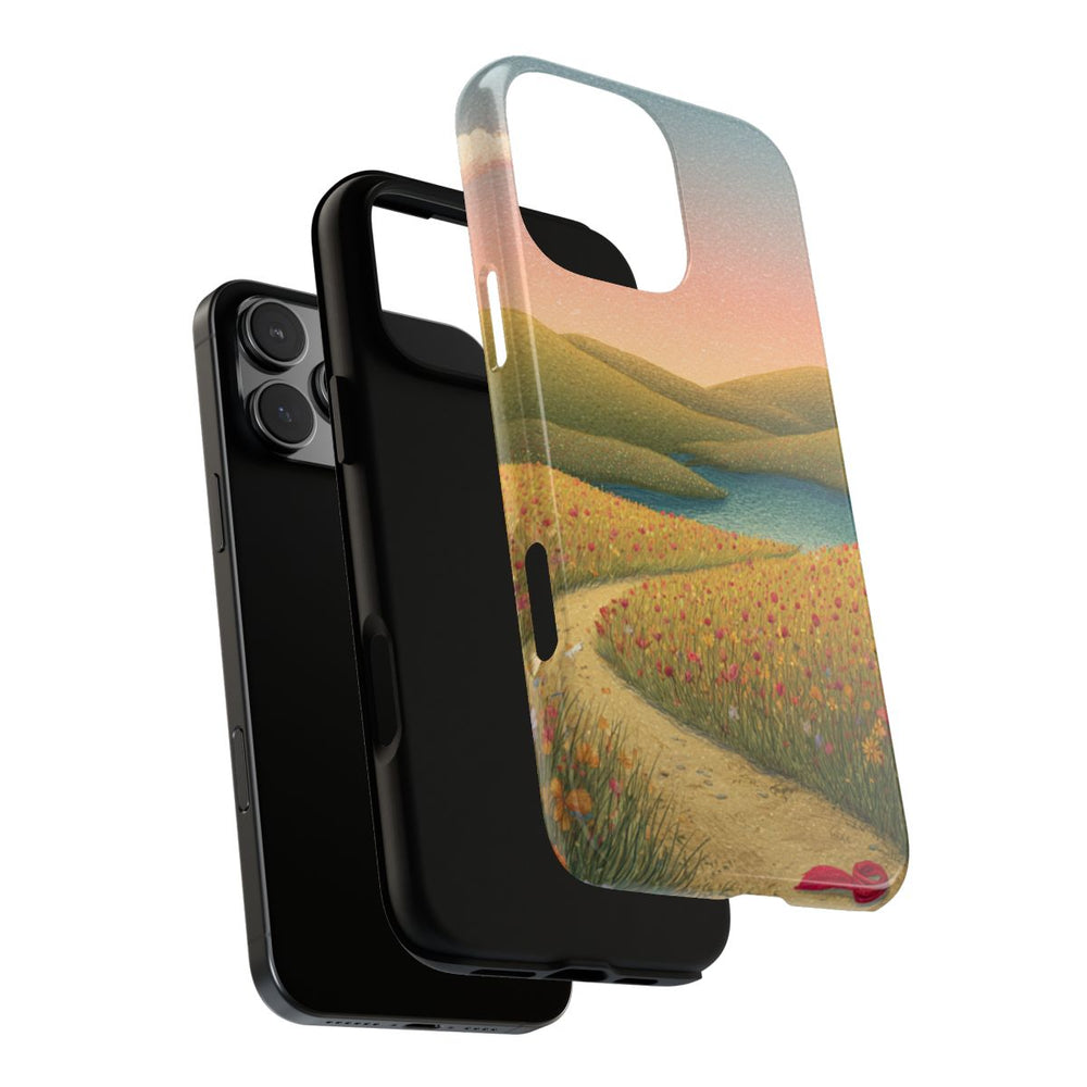 Dit hoesje toont een slingerend zandpad door een kleurrijke bloemenweide met bloemen in rood, oranje, geel en paars. Het pad voert naar een rustig blauw meer, omringd door zachtgroene heuvels onder een pastelgekleurde lucht die verloopt van roze naar blauw. Witte veren dwarrelen door de lucht en op het pad ligt een opgevouwen rode sjaal. De illustratie heeft een zachte, getekende stijl met zichtbare kleurpotlooddetails, alsof het uit een prentenboek komt. Het hoesje bestaat uit twee lagen: een harde polycarbonaat buitenkant en een TPU binnenzijde. Het ondersteunt draadloos opladen en is bestand tegen verschillende weersomstandigheden.