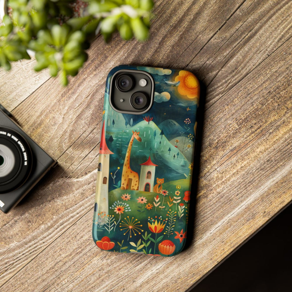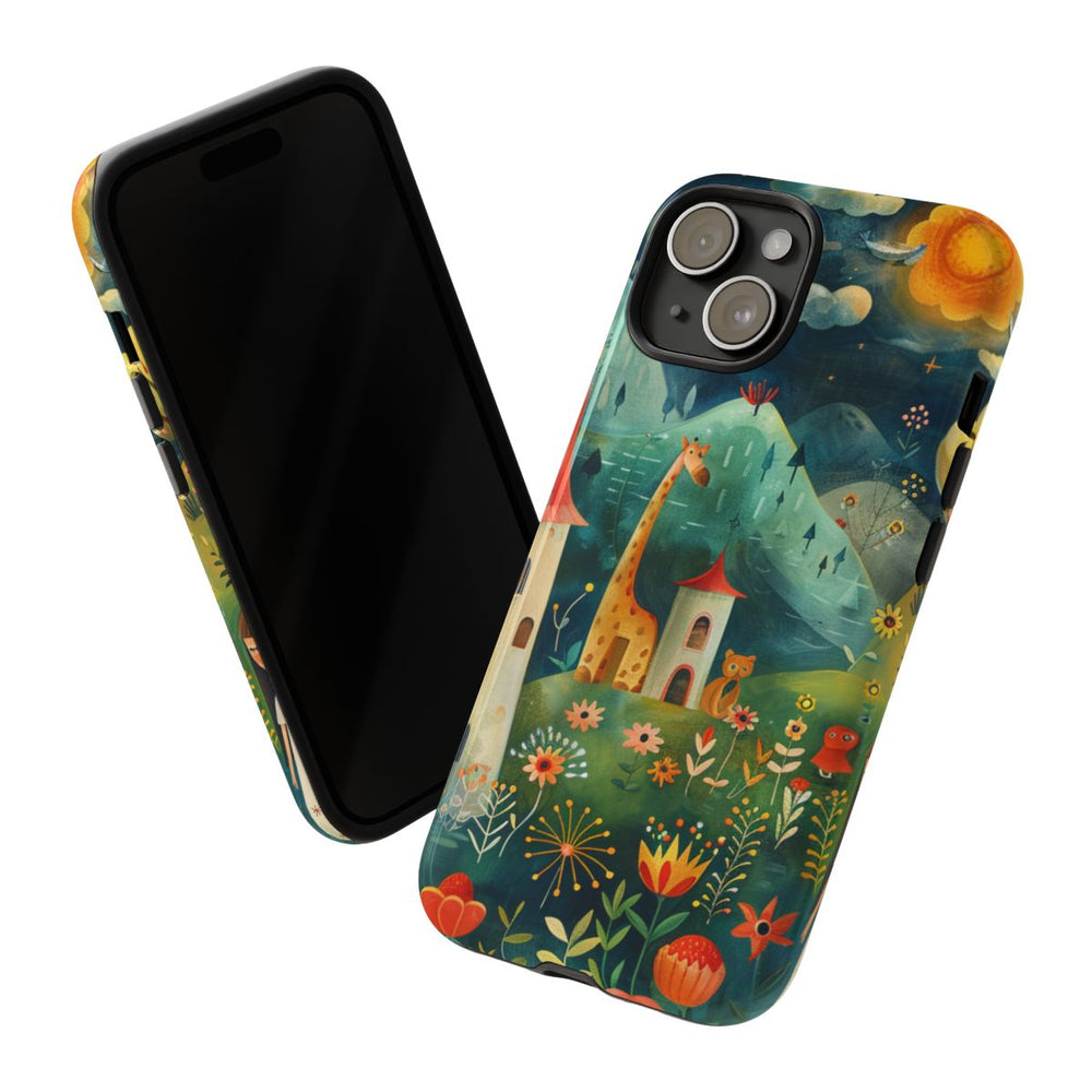 Dit hoesje toont een sprookjesachtig fantasielandschap onder een nachtelijke sterrenhemel met een sikkelmaan, een stralende zon en een bloemvormige zon. In het tafereel zie je glooiende groene heuvels, hoge bomen, kleurrijke bloemen en charmante torentjes met rode daken. Een meisje in een witte jurk staat tussen de bloemen, vergezeld door dieren zoals een giraf, een beer en twee vossen. Het ontwerp gebruikt een rijk palet van groentinten, oranje en blauw met een zachte, uitnodigende gloed. Het hoesje bestaat uit twee lagen: een glanzende buitenkant van polycarbonaat en een TPU-binnenzijde. Het ondersteunt draadloos opladen en is bestand tegen verschillende weersomstandigheden.