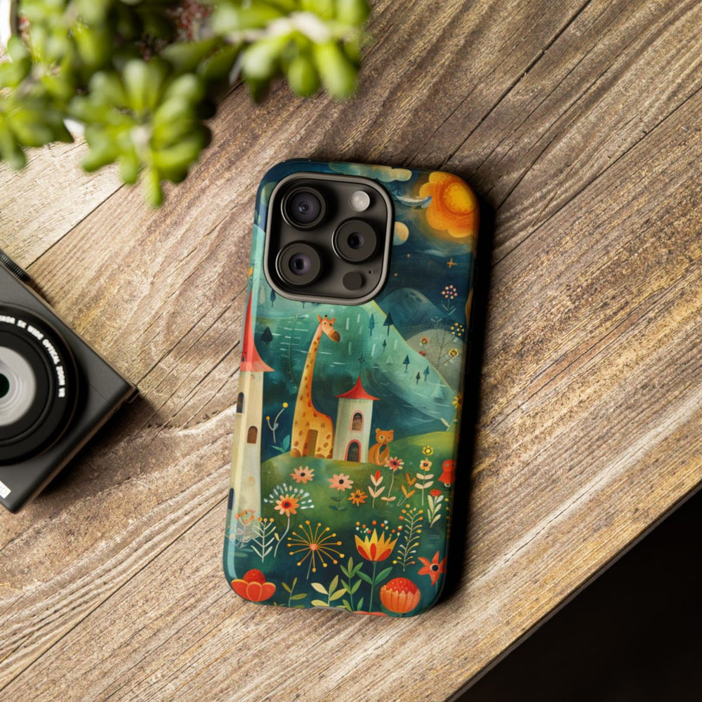Dit hoesje toont een sprookjesachtig fantasielandschap onder een nachtelijke sterrenhemel met een sikkelmaan, een stralende zon en een bloemvormige zon. In het tafereel zie je glooiende groene heuvels, hoge bomen, kleurrijke bloemen en charmante torentjes met rode daken. Een meisje in een witte jurk staat tussen de bloemen, vergezeld door dieren zoals een giraf, een beer en twee vossen. Het ontwerp gebruikt een rijk palet van groentinten, oranje en blauw met een zachte, uitnodigende gloed. Het hoesje bestaat uit twee lagen: een glanzende buitenkant van polycarbonaat en een TPU-binnenzijde. Het ondersteunt draadloos opladen en is bestand tegen verschillende weersomstandigheden.