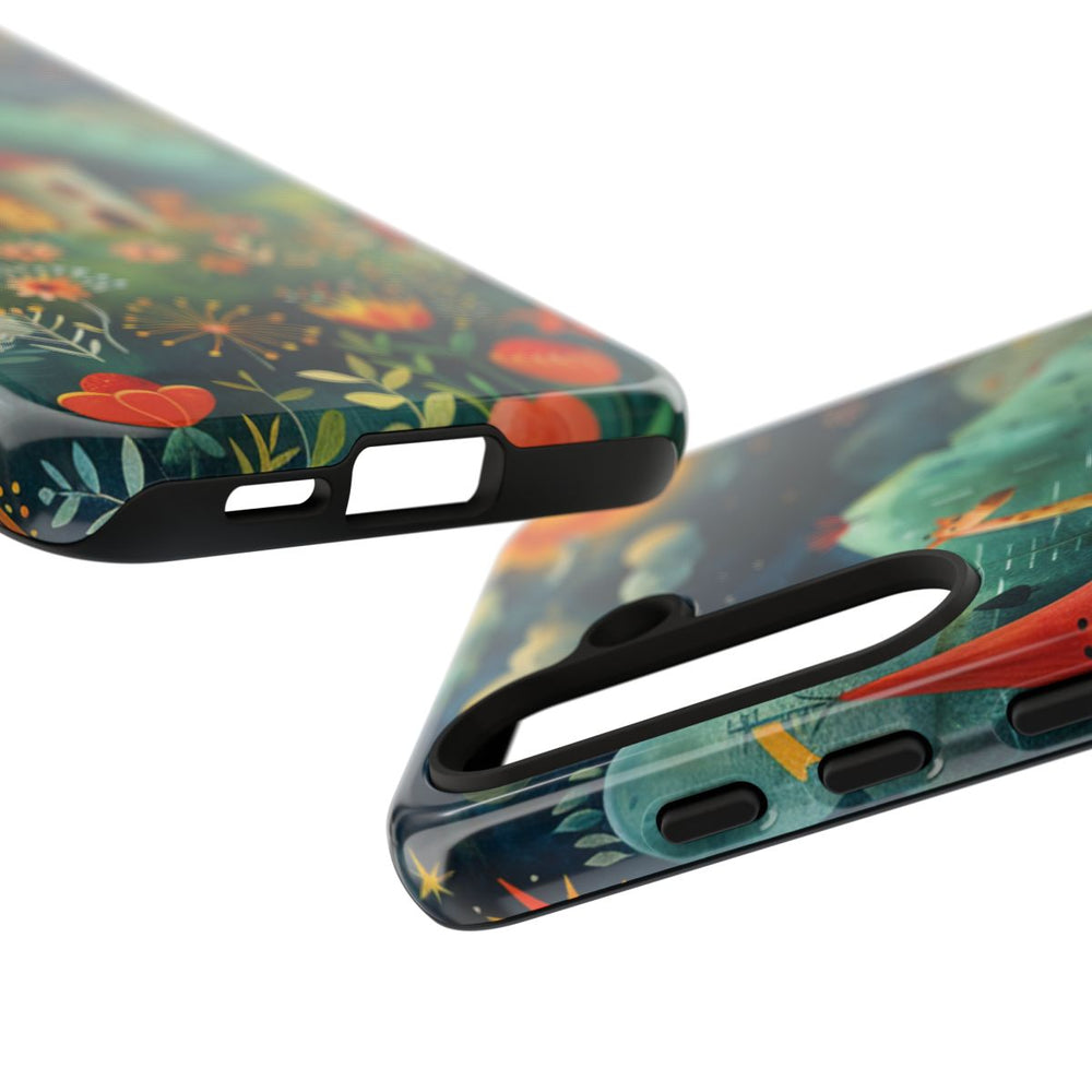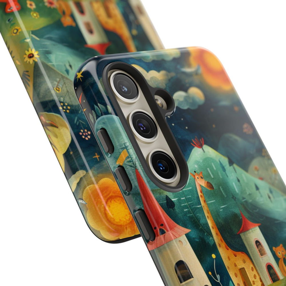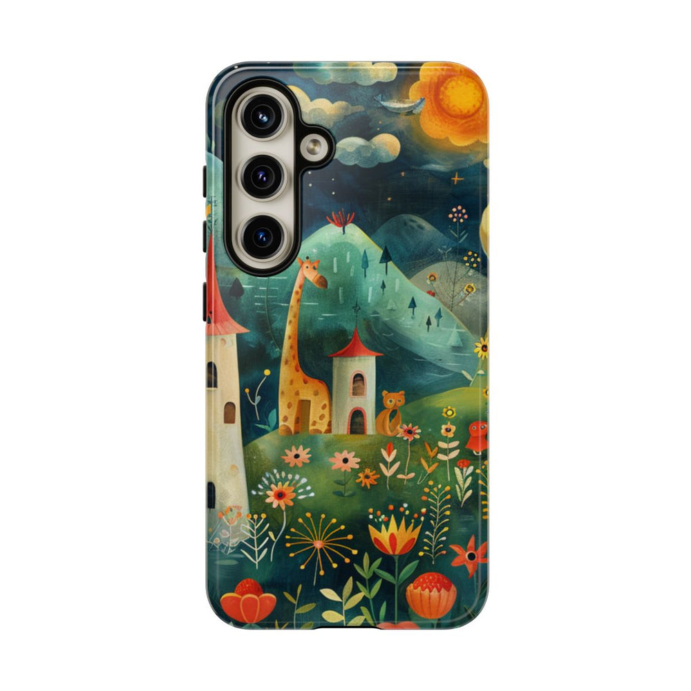 Dit hoesje toont een sprookjesachtig fantasielandschap onder een nachtelijke sterrenhemel met een sikkelmaan, een stralende zon en een bloemvormige zon. In het tafereel zie je glooiende groene heuvels, hoge bomen, kleurrijke bloemen en charmante torentjes met rode daken. Een meisje in een witte jurk staat tussen de bloemen, vergezeld door dieren zoals een giraf, een beer en twee vossen. Het ontwerp gebruikt een rijk palet van groentinten, oranje en blauw met een zachte, uitnodigende gloed. Het hoesje bestaat uit twee lagen: een glanzende buitenkant van polycarbonaat en een TPU-binnenzijde. Het ondersteunt draadloos opladen en is bestand tegen verschillende weersomstandigheden.