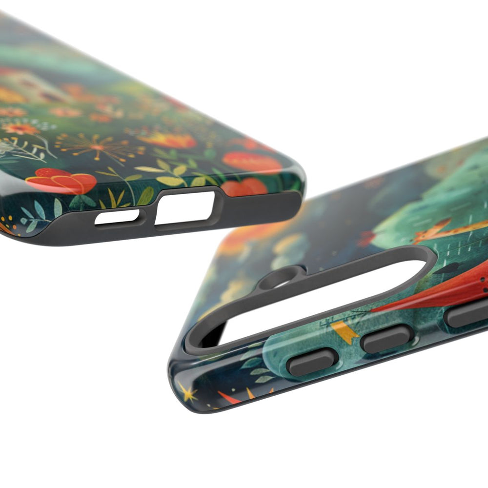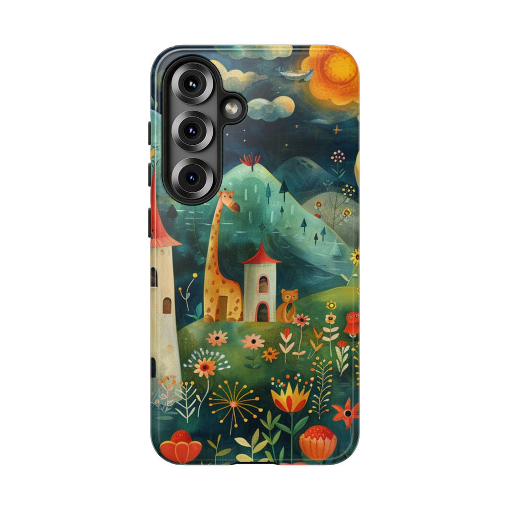 Dit hoesje toont een sprookjesachtig fantasielandschap onder een nachtelijke sterrenhemel met een sikkelmaan, een stralende zon en een bloemvormige zon. In het tafereel zie je glooiende groene heuvels, hoge bomen, kleurrijke bloemen en charmante torentjes met rode daken. Een meisje in een witte jurk staat tussen de bloemen, vergezeld door dieren zoals een giraf, een beer en twee vossen. Het ontwerp gebruikt een rijk palet van groentinten, oranje en blauw met een zachte, uitnodigende gloed. Het hoesje bestaat uit twee lagen: een glanzende buitenkant van polycarbonaat en een TPU-binnenzijde. Het ondersteunt draadloos opladen en is bestand tegen verschillende weersomstandigheden.