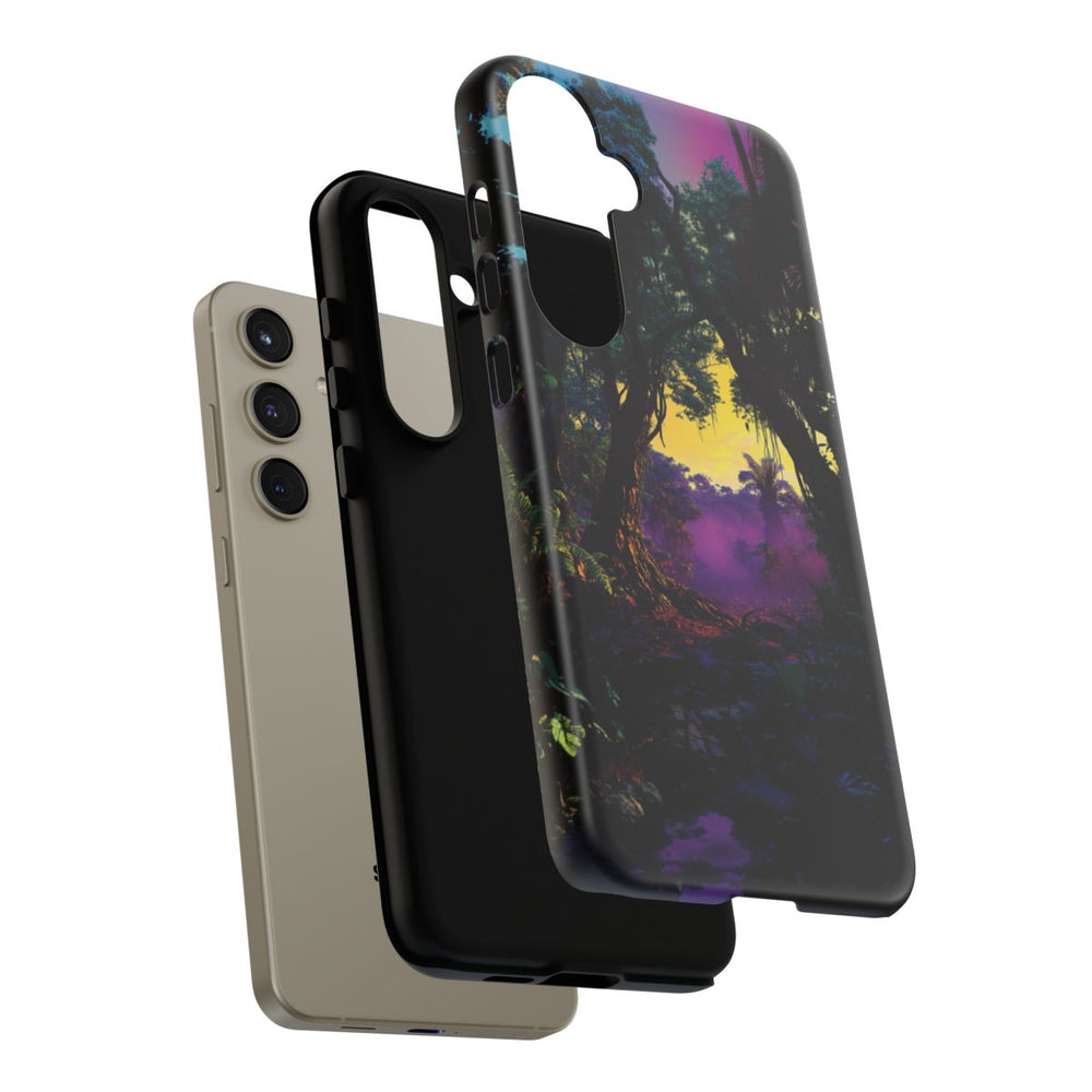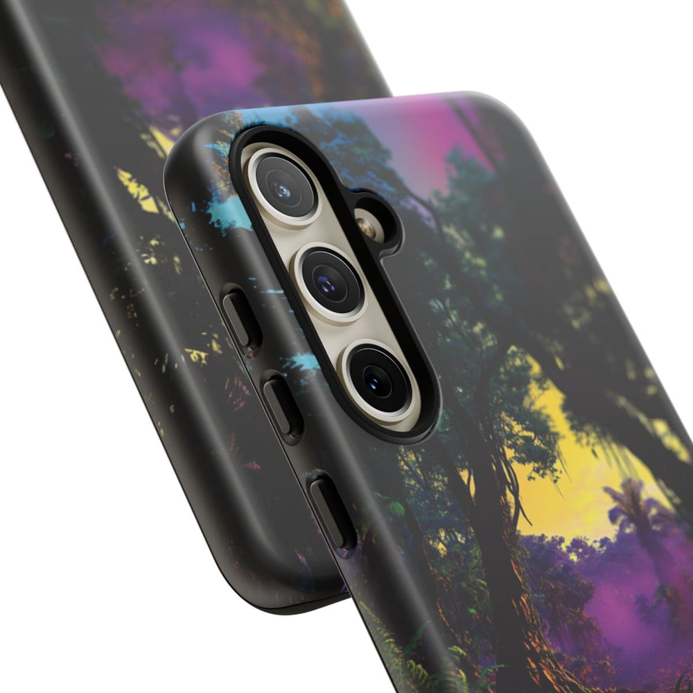 Dit hoesje toont een sprookjesachtig jungletafereel met dichtbegroeide planten en hoge bomen die een kleurrijke zonsondergang omlijsten. De lucht gaat vloeiend over van geel naar paars en verlicht de junglevloer en nevel met warme tinten. In het ontwerp zijn ook rotsen, planten en een kleine waterreflectie te zien, allemaal afgezet tegen een zwarte achtergrond. Het hoesje bestaat uit twee lagen: een stevige polycarbonaat buitenkant en een schokabsorberende TPU-binnenzijde. Ondersteunt draadloos opladen.