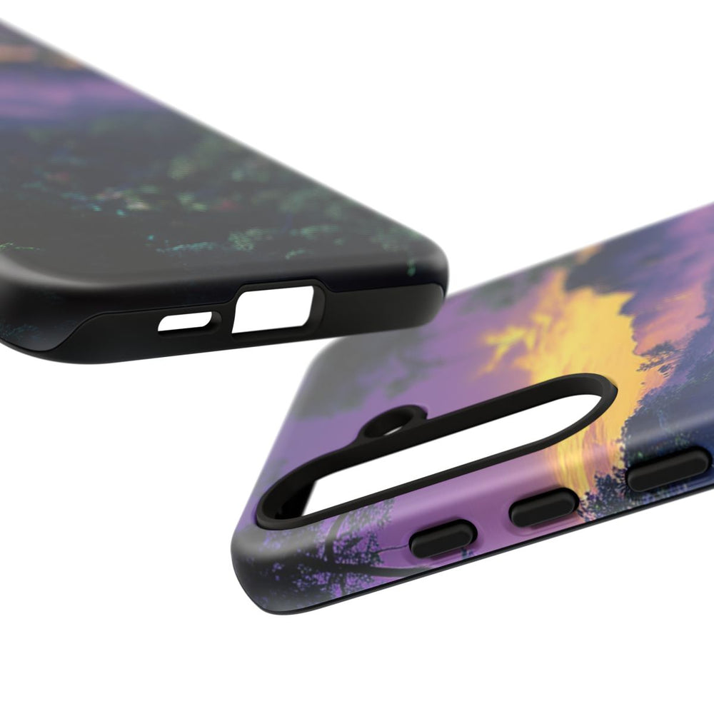Dit hoesje toont een betoverend junglelandschap met een panoramisch uitzicht. Op de achtergrond verandert een diepzwarte lucht in een gele en paarse zonsondergang. Vreemde bomen en reusachtige rotsen steken uit boven dichte mist, wat het geheel een mysterieus karakter geeft. Het hoesje heeft een dubbele laag voor extra stevigheid en bescherming en is geschikt voor draadloos opladen. Ideaal voor liefhebbers van natuur en bijzondere kunst.