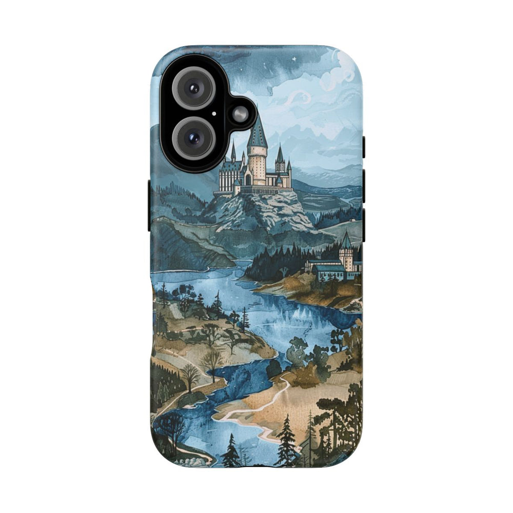 Dit hoesje is voorzien van een met de hand geschilderde illustratie van een betoverend landschap met een kasteel, gelegen tegen een achtergrond van bergen en een rivier. De afbeelding is uitgevoerd in zachte, gedempte tinten blauw en groen. Op de voorgrond zijn bomen en een kronkelende rivier te zien, terwijl het kasteel statig op een rots prijkt. Deze kunstzinnige weergave brengt de magische sfeer van een fantasiewereld tot leven en maakt het hoesje tot een bijzondere keuze. Het hoesje is gemaakt van stevige materialen en ondersteunt draadloos opladen.