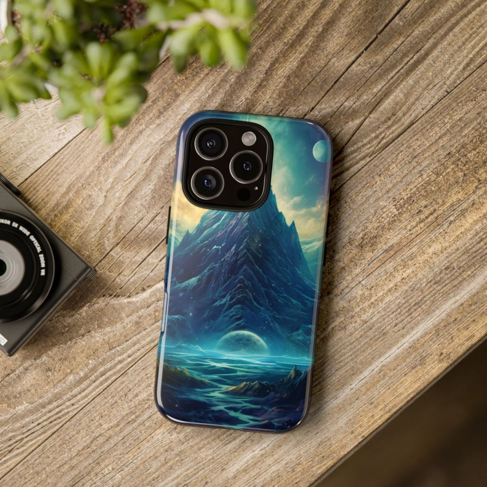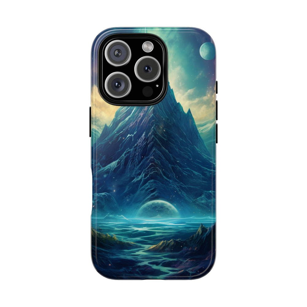 Dit hoesje toont een indrukwekkende berg met scherpe pieken, die van achteren wordt verlicht door een mysterieus schijnsel. Aan de voet van de berg stroomt een brede rivier of lichtstroom, wat het geheel een surrealistisch karakter geeft. De lucht is gevuld met kleurrijke nevels en twee duidelijk zichtbare planeten, wat de buitenaardse sfeer versterkt. Het ontwerp combineert natuurlijke berglandschappen met een diep ruimte-decor, voor een magisch en dramatisch effect. Het hoesje heeft een glanzende afwerking, bestaat uit twee beschermende lagen en ondersteunt draadloos opladen.
