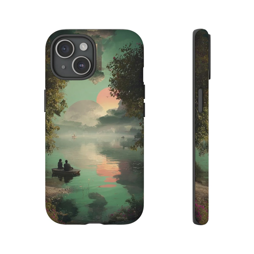 Dit telefoonhoesje toont een vredig tafereel aan het meer, waar twee mensen in een klein bootje dicht bij de oever zitten. Het water weerspiegelt de zachte pasteltinten van de ondergaande zon, terwijl grote, dromerige wolken en twee hemellichamen aan de lucht te zien zijn. Weelderige groene bomen omlijsten het uitzicht aan beide zijden en langs de waterkant bloeien felroze bloemen. De sfeer is kalm en bijna buitenaards, met een mix van natuurlijke en fantasierijke details. Het hoesje heeft een matte afwerking, bestaat uit twee lagen met een polycarbonaat buitenkant en een TPU-binnenzijde, en is ontworpen voor extra stevigheid en bescherming, ook buitenshuis.