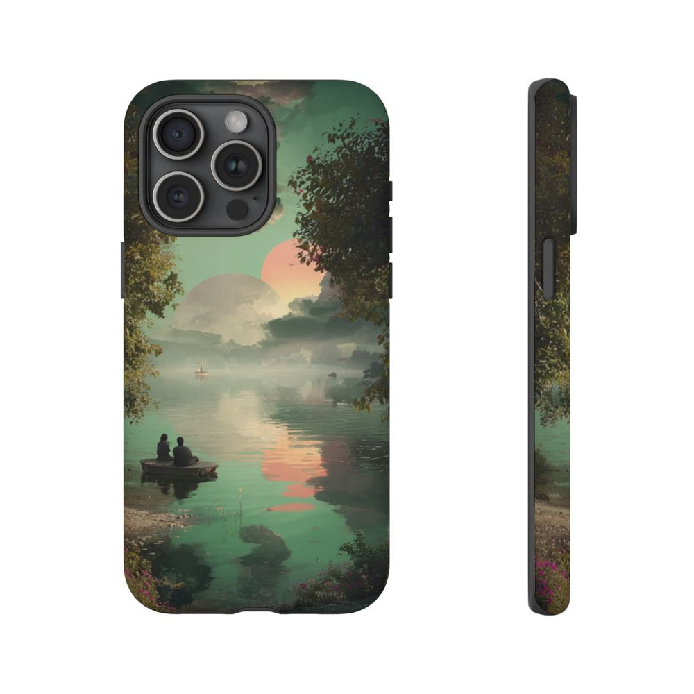 Dit telefoonhoesje toont een vredig tafereel aan het meer, waar twee mensen in een klein bootje dicht bij de oever zitten. Het water weerspiegelt de zachte pasteltinten van de ondergaande zon, terwijl grote, dromerige wolken en twee hemellichamen aan de lucht te zien zijn. Weelderige groene bomen omlijsten het uitzicht aan beide zijden en langs de waterkant bloeien felroze bloemen. De sfeer is kalm en bijna buitenaards, met een mix van natuurlijke en fantasierijke details. Het hoesje heeft een matte afwerking, bestaat uit twee lagen met een polycarbonaat buitenkant en een TPU-binnenzijde, en is ontworpen voor extra stevigheid en bescherming, ook buitenshuis.