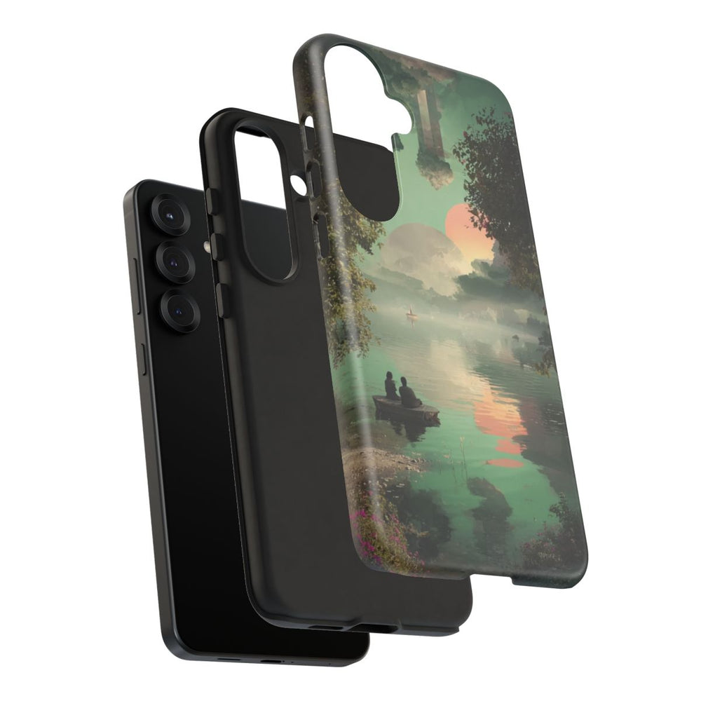 Dit telefoonhoesje toont een vredig tafereel aan het meer, waar twee mensen in een klein bootje dicht bij de oever zitten. Het water weerspiegelt de zachte pasteltinten van de ondergaande zon, terwijl grote, dromerige wolken en twee hemellichamen aan de lucht te zien zijn. Weelderige groene bomen omlijsten het uitzicht aan beide zijden en langs de waterkant bloeien felroze bloemen. De sfeer is kalm en bijna buitenaards, met een mix van natuurlijke en fantasierijke details. Het hoesje heeft een matte afwerking, bestaat uit twee lagen met een polycarbonaat buitenkant en een TPU-binnenzijde, en is ontworpen voor extra stevigheid en bescherming, ook buitenshuis.