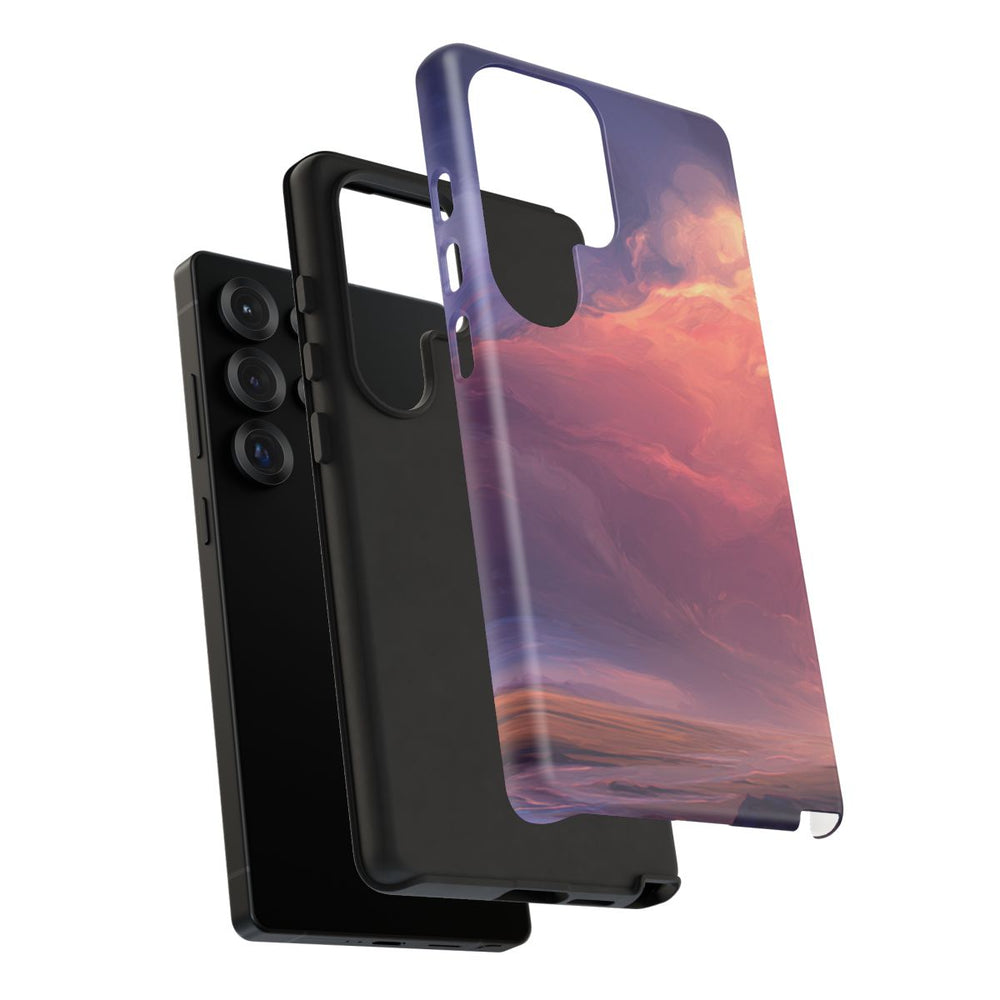 Dit hoesje toont een betoverend landschap met een dramatische zonsondergang en golvende wolken in paarse, roze en oranje tinten. Aan de rechterkant staat een eenzame persoon die uitkijkt over de uitgestrekte horizon. Links op een rotsachtige heuvel staat een klein gebouw. De ondergrond bestaat uit donkere en lichte kleuren met een kronkelende rivier of beek die door het landschap stroomt. Het hoesje is gemaakt van polycarbonaat en TPU, biedt uitstekende bescherming en ondersteunt draadloos opladen.