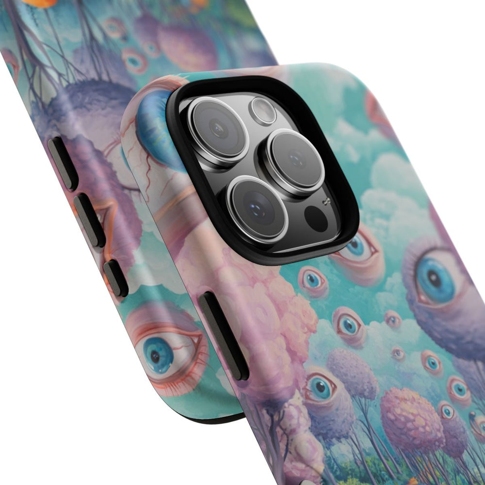 Dit hoesje toont een fantasierijk tafereel van een kind dat over een oranje pad loopt, omringd door bomen met pluizige roze en paarse bladeren. Grote, zwevende blauwe ogen verschijnen tussen de bomen en in de lucht, die overgaat in zachte wolken. Op de achtergrond zie je een heldere turquoise lucht met witte wolken. Het hoesje bestaat uit twee lagen: een stevige polycarbonaat buitenkant en een TPU-binnenzijde. Het ondersteunt draadloos opladen en is bestand tegen verschillende weersomstandigheden.