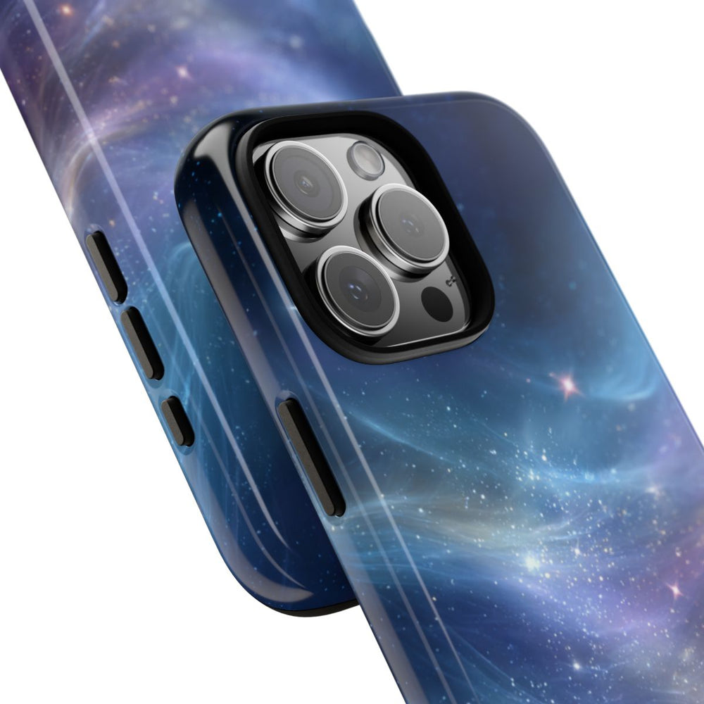 Dit hoesje toont een surrealistisch tafereel van de kosmos, met draaiende nevelwolken en talloze sterren verspreid over een diepblauwe en violette nachtelijke hemel. Sluierachtige lichtsporen en fonkelend sterrenstof zorgen voor een dromerige, abstracte ruimte-uitstraling. De afbeelding is gedrukt op een glanzend, stevig hoesje met een dubbele laag van een polycarbonaat buitenkant en een TPU-binnenzijde. Dit biedt extra stevigheid en bescherming, en ondersteunt draadloos opladen. De kleuren vloeien naadloos in elkaar over en roepen een spirituele, hemelse sfeer op.