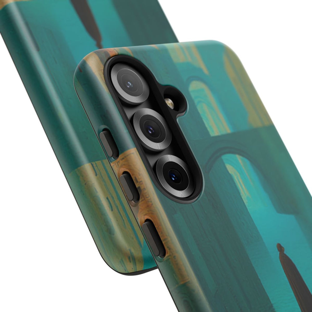 Dit hoesje toont een sprookjesachtig stadsgezicht met hoge, blokvormige gebouwen in tinten teal en oranje. Over het kalme water loopt een stenen brug, waarop een eenzaam figuur in donkere kleding staat. De architectuur heeft bogen en kleine ramen, wat zorgt voor een mysterieuze en rustgevende sfeer. Het hoesje bestaat uit twee lagen met een stevige polycarbonaat buitenkant en een TPU binnenzijde. Geschikt voor draadloos opladen en bestand tegen verschillende weersomstandigheden.