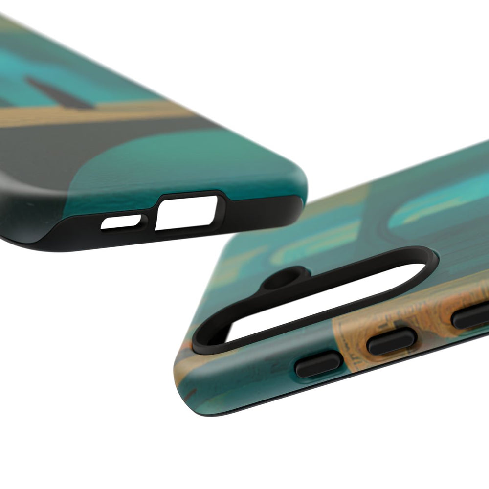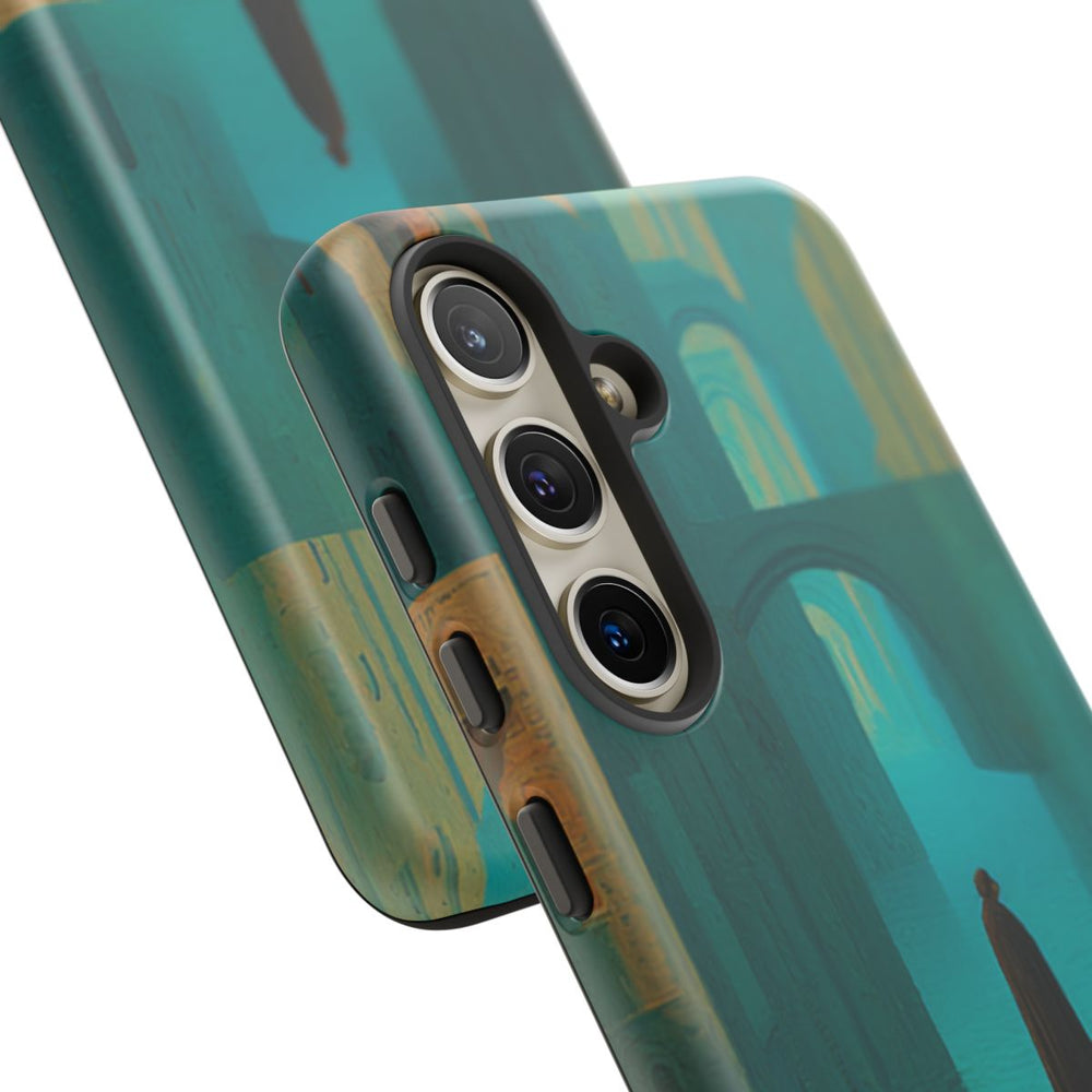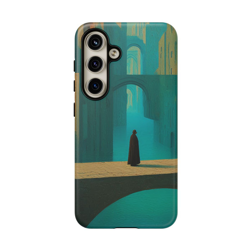 Dit hoesje heeft een uniek ontwerp met een sprookjesachtig stadsgezicht, waarin hoge, blokvormige gebouwen in tinten blauwgroen en oranje te zien zijn. Een eenzame figuur in donkere kleding staat op een stenen brug die over rustig blauw water loopt. De gebouwen hebben bogen en ramen die lange schaduwen werpen en zo diepte aan het tafereel geven. Het hoesje is voorzien van een dubbele laag met een polycarbonaat buitenkant en een TPU-binnenzijde. Geschikt voor draadloos opladen en bestand tegen verschillende weersomstandigheden.