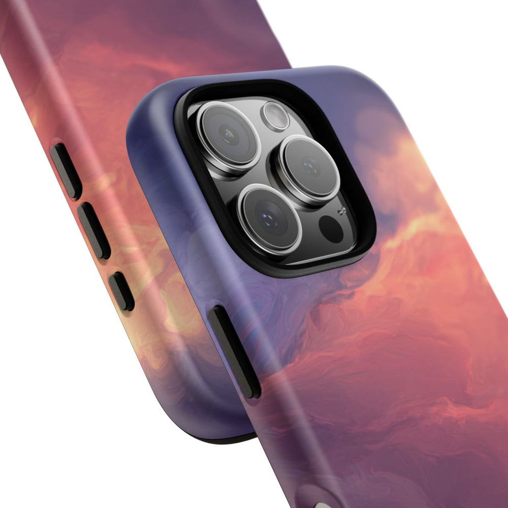 Dit telefoonhoesje heeft een sprookjesachtig landschap met een uitgestrekte vlakte onder een indrukwekkende hemel vol draaiende wolken in tinten paars, roze en oranje. Rechts staat een kleine figuur, terwijl links op een heuveltop een bouwwerk met een lichtje te zien is. De afbeelding is rijk aan details en heeft een schilderachtige uitstraling, wat zorgt voor een dromerige sfeer. Het hoesje is gemaakt van polycarbonaat en TPU, wat zorgt voor stevigheid en ondersteuning van draadloos opladen.