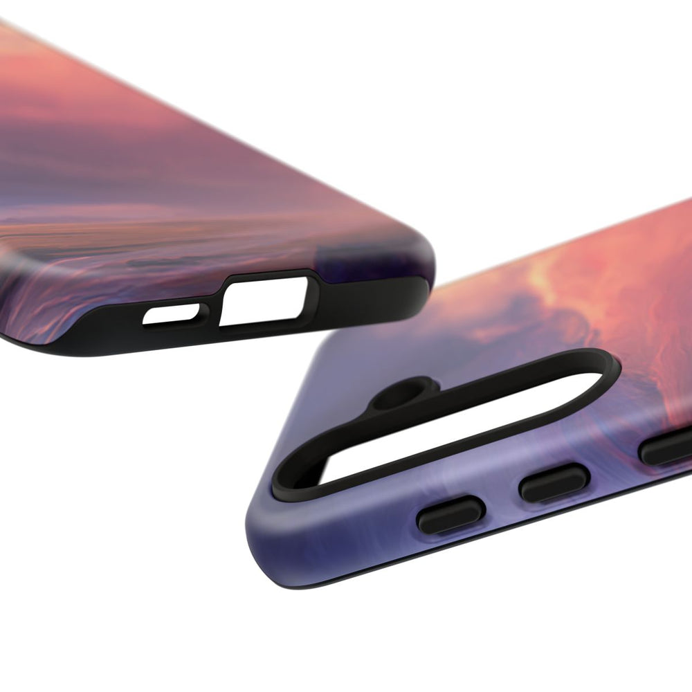 Dit hoesje is voorzien van een sprookjesachtig landschap met een dramatische lucht vol draaiende wolken in paarse, roze en oranje tinten. Op de voorgrond staat een eenzame figuur op een vlakke ondergrond, vlak bij een waterpartij die de kleurrijke hemel weerspiegelt. In de verte prijkt een klein gebouw op een rotsachtige heuvel. Het ontwerp is rijk aan details en geschilderd in een conceptuele kunststijl. Het hoesje is gemaakt van polycarbonaat en TPU en biedt stevige bescherming met twee lagen. Geschikt voor draadloos opladen.