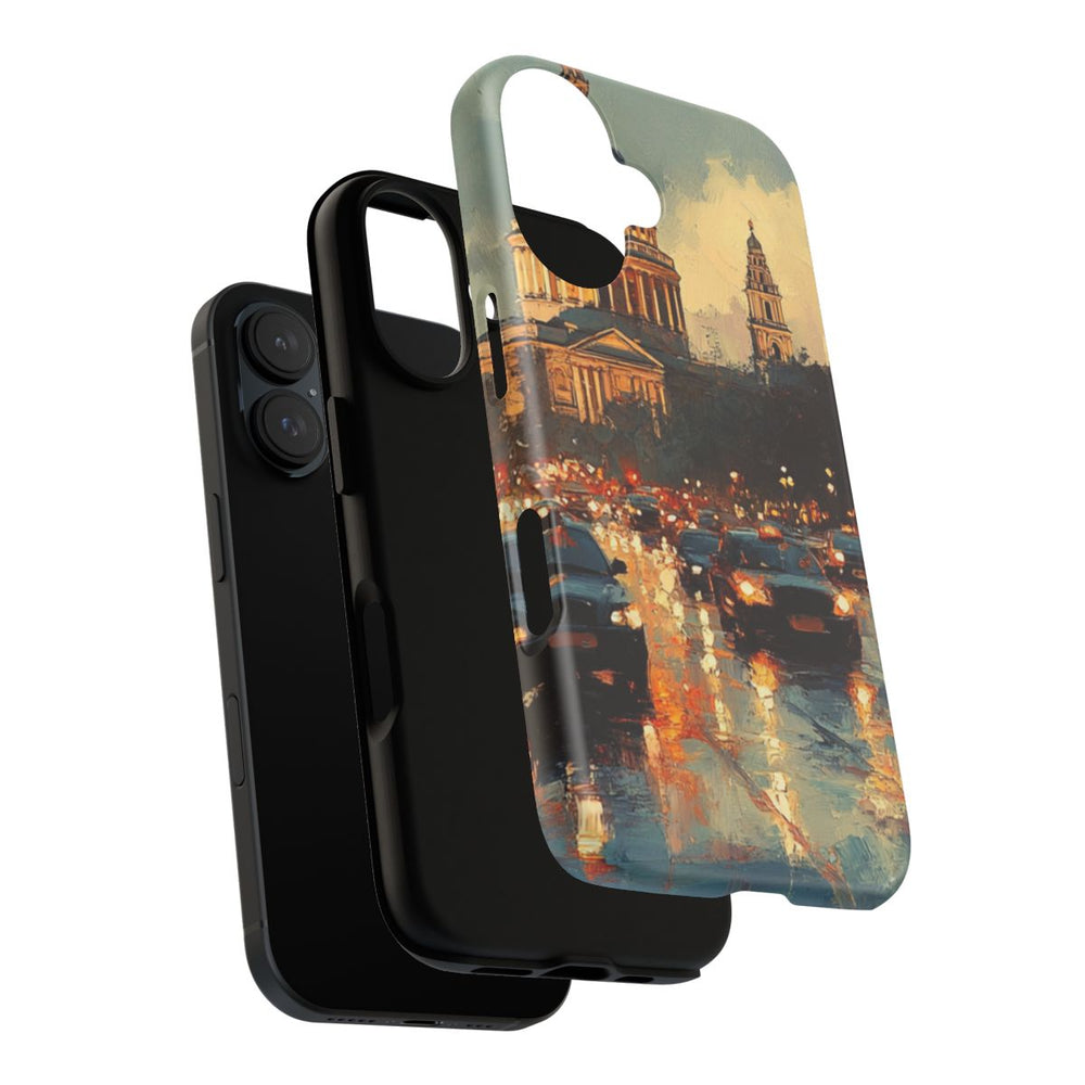 Dit hoesje toont een sfeervol stadsbeeld bij schemering, met op de achtergrond een imposante kathedraal met een opvallende koepel. De natte straat weerspiegelt het licht van auto's en straatlantaarns. Auto's met brandende koplampen rijden over de weg en op de trottoirs zijn silhouetten van voorbijgangers zichtbaar. De gebouwen aan weerszijden zijn rijk gedetailleerd en warme lichtjes schijnen uit de ramen. Het stevige hoesje heeft een dubbele laag met een matte afwerking, is gemaakt van polycarbonaat en TPU en ondersteunt draadloos opladen.