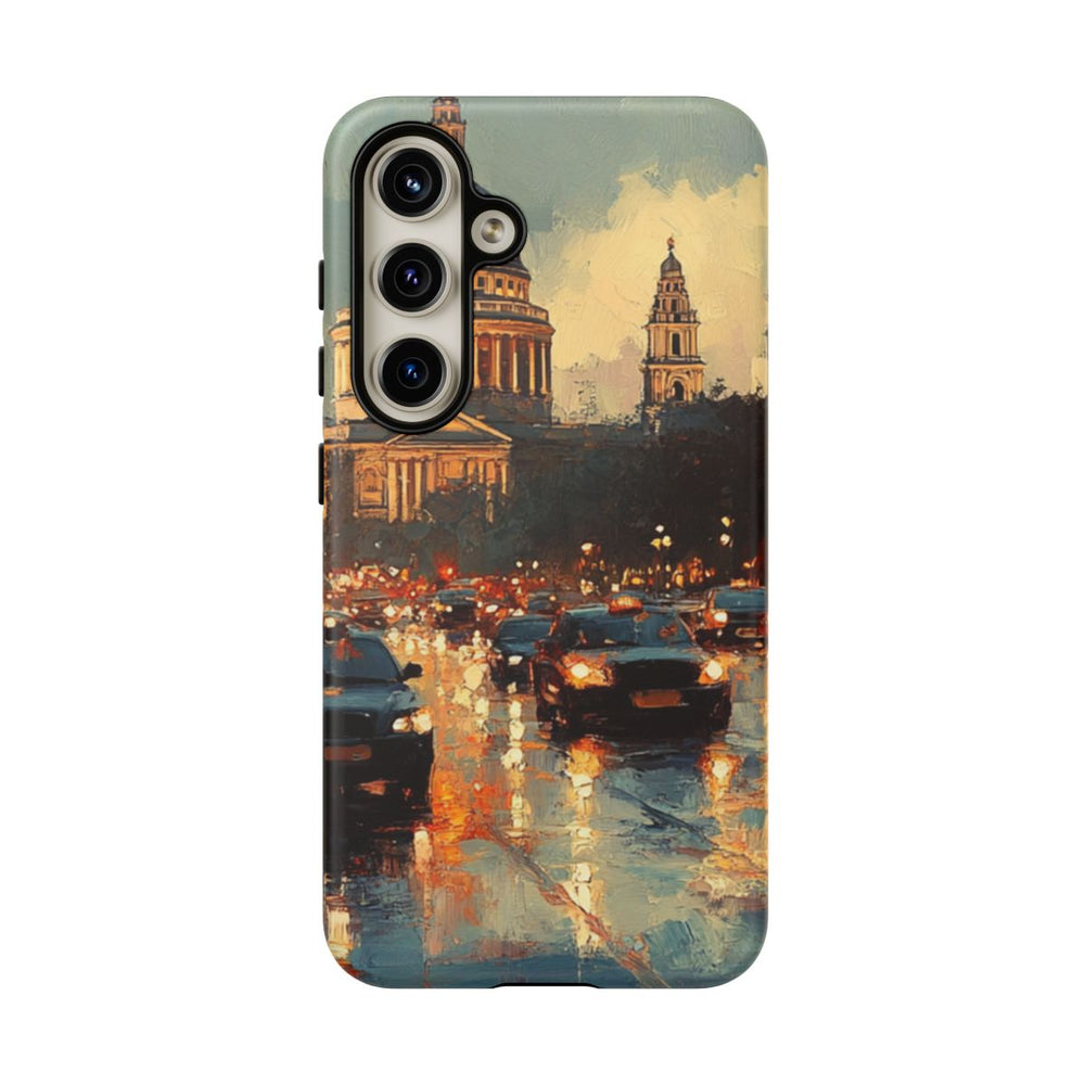 Dit hoesje toont een sfeervolle stadsstraat bij schemering, met op de achtergrond een grote kathedraal met een opvallende koepel. De natte straat weerspiegelt het licht van auto’s en straatlantaarns, wat zorgt voor een warme gloed op het wegdek. Op de voorgrond zijn verschillende auto’s met brandende koplampen en silhouetten van mensen op de stoep te zien. Het ontwerp heeft een schilderachtige uitstraling met rijke, warme verlichting en koel blauwgrijze tinten in lucht en straat. Het matte, stevige telefoonhoesje bestaat uit een polycarbonaat buitenkant en een TPU-binnenzijde, is duurzaam, bestand tegen buitengebruik en geschikt voor draadloos opladen.