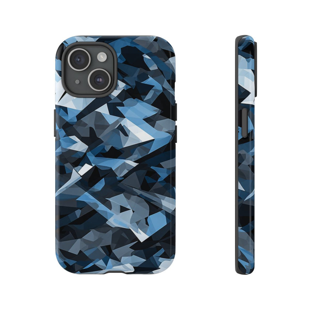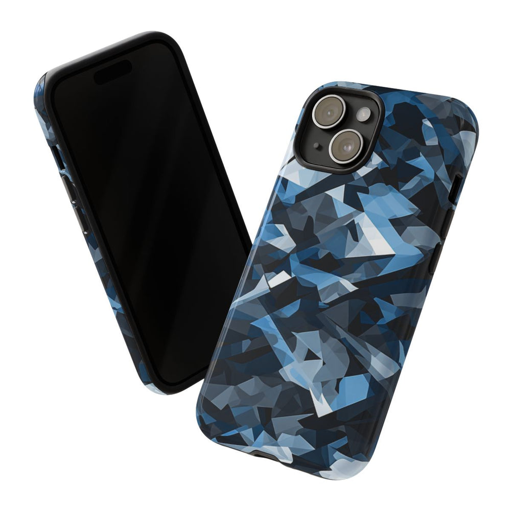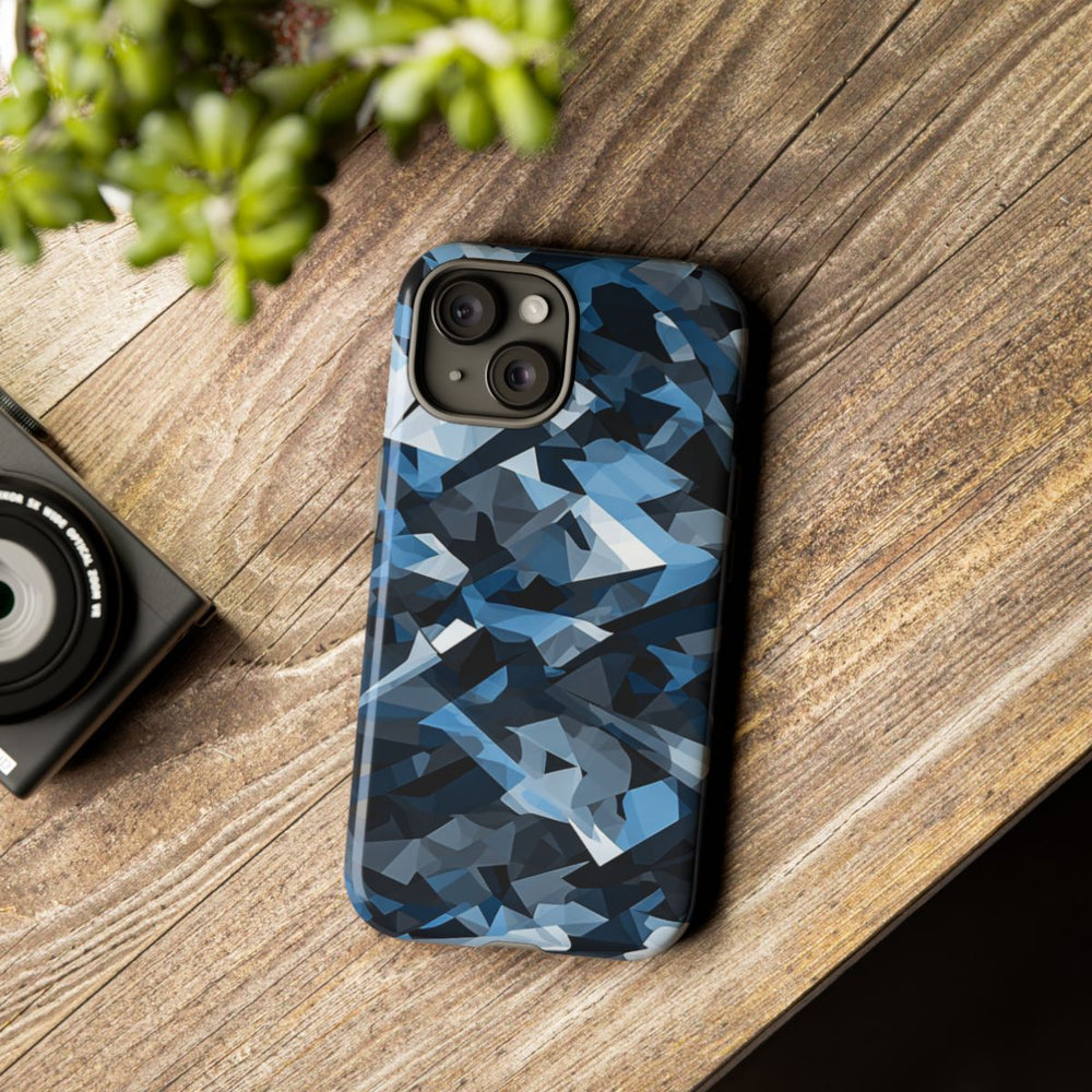 Dit hoesje heeft een abstract stedelijk camouflagepatroon met overlappende geometrische vormen. De vormen verschillen in grootte en vorm, wat zorgt voor een gelaagd en dynamisch effect. De kleuren lopen uiteen van zwart, grijs, blauwgrijs tot wit en vloeien subtiel in elkaar over voor een moderne uitstraling. Het patroon is gedrukt op een glanzend, stevig hoesje met een polycarbonaat buitenkant en een TPU-binnenzijde. Dit biedt dubbele bescherming en ondersteunt draadloos opladen. Het hoesje is ontworpen voor duurzaamheid en bestand tegen gebruik buitenshuis.