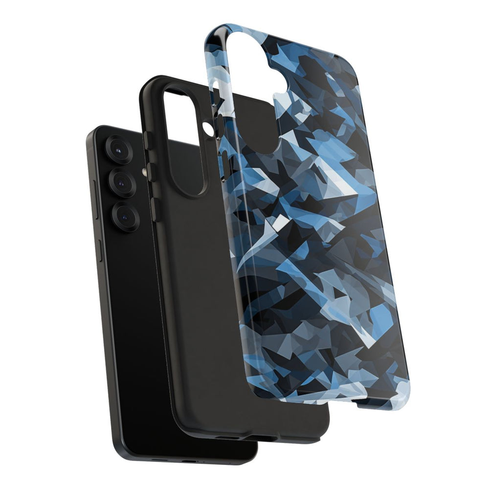 Dit hoesje heeft een abstract stedelijk camouflagepatroon met overlappende geometrische vormen. De vormen verschillen in grootte en vorm, wat zorgt voor een gelaagd en dynamisch effect. De kleuren lopen uiteen van zwart, grijs, blauwgrijs tot wit en vloeien subtiel in elkaar over voor een moderne uitstraling. Het patroon is gedrukt op een glanzend, stevig hoesje met een polycarbonaat buitenkant en een TPU-binnenzijde. Dit biedt dubbele bescherming en ondersteunt draadloos opladen. Het hoesje is ontworpen voor duurzaamheid en bestand tegen gebruik buitenshuis.