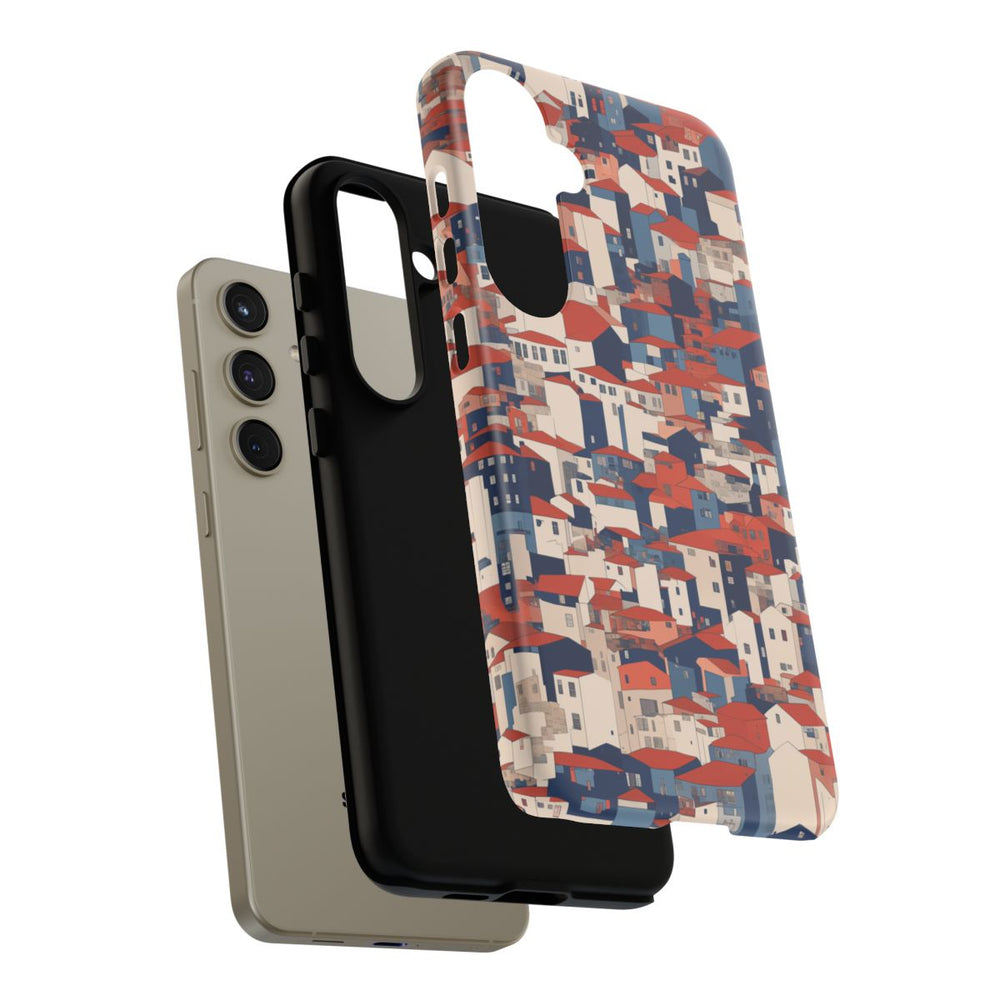 Dit hoesje heeft een levendig patroon van dicht op elkaar staande, gestileerde stadswoningen met rode daken en muren in crème-, blauw- en beigetinten. De huizen zijn nauw aaneengesloten afgebeeld, wat zorgt voor een naadloos, textielachtig effect met gedetailleerde ramen en diverse gebouwvormen. De afbeelding is gedrukt op een mat hoesje met een stevige polycarbonaat buitenkant en een TPU binnenzijde, voor optimale bescherming en ondersteuning van draadloos opladen. Het geheel oogt warm, kleurrijk en architectonisch.